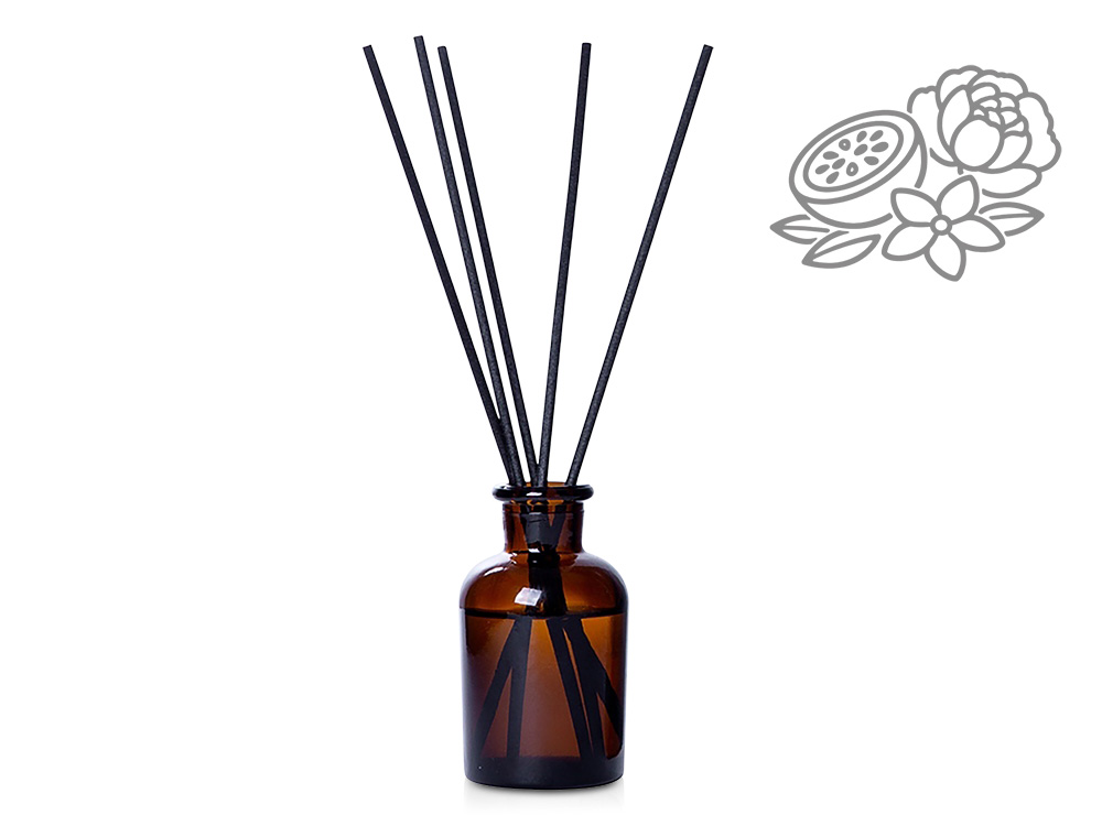 Объём диффузора 50 мл. Его будет достаточно для умеренного поддержания аромата в комнате до 15м2 в течение двух месяцев использования. Насыщенность аромата регулируется количеством используемых фибровых палочек.