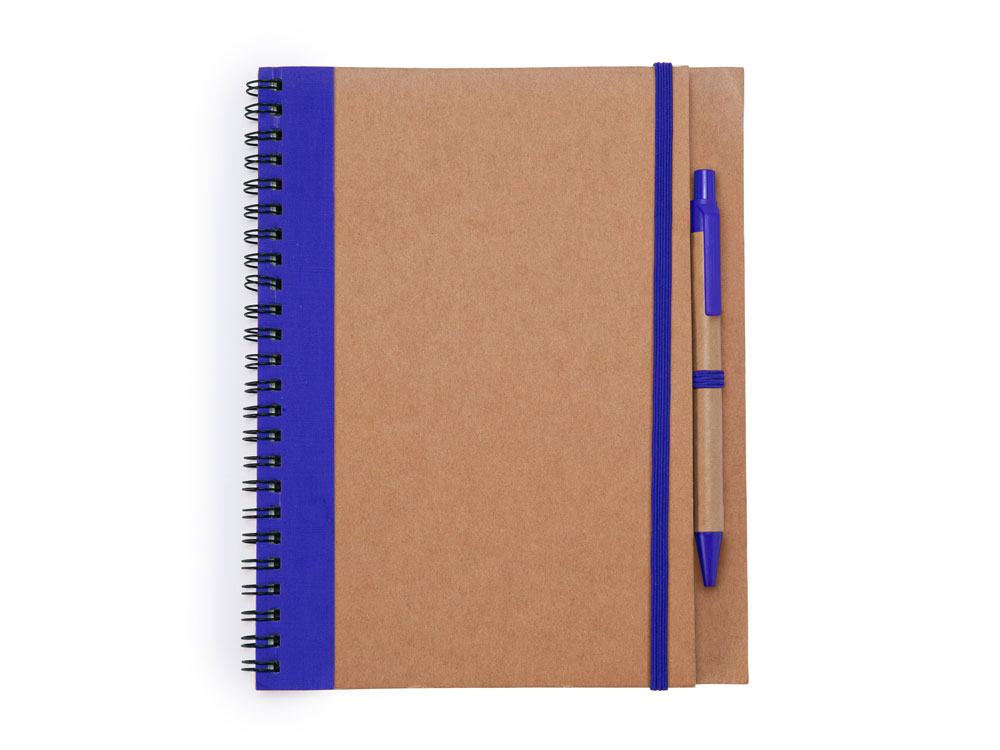 Блокнот на спирали с жесткой обложкой из переработанного картона. Включает шариковую ручку с синими чернилами. 60 простых листов. Трафаретная печать по твердым материалам (1 цвет (цветные изделия)) на данный товар осуществляется бесплатно. Оплачивается только настройка оборудования в размере 4500 рублей на весь тираж.