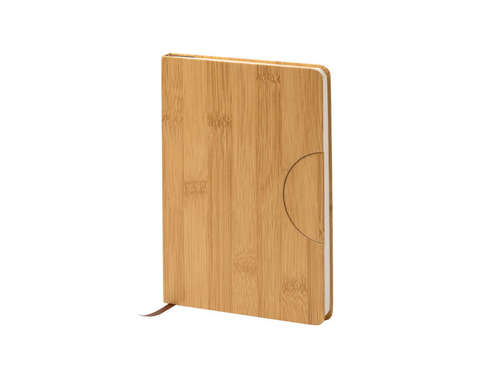 Блокнот формата А5 с жесткой обложкой с эффектом бамбука и функцией подставки. Закладка и 80 простых листов. Трафаретная печать по твердым материалам (1 цвет (цветные изделия)) на данный товар осуществляется бесплатно. Оплачивается только настройка оборудования в размере 4500 рублей на весь тираж.