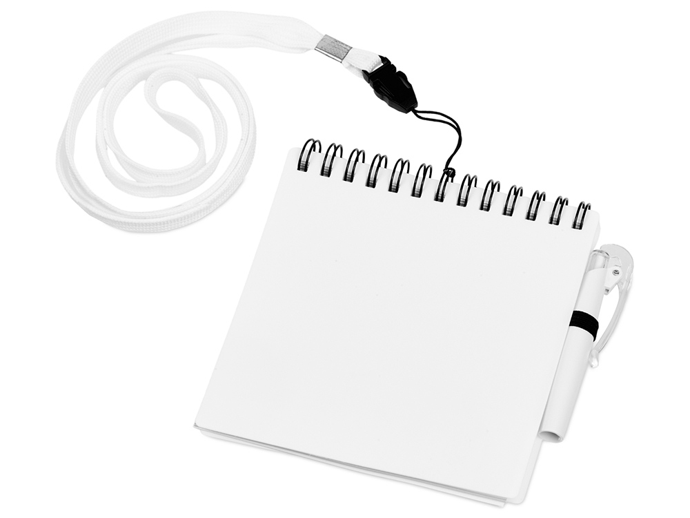 Яркий блокнот с шариковой ручкой можно носить на шее благодаря специальному ремешку. Отличный промо-сувенир, на обложку которого можно нанести логотип.