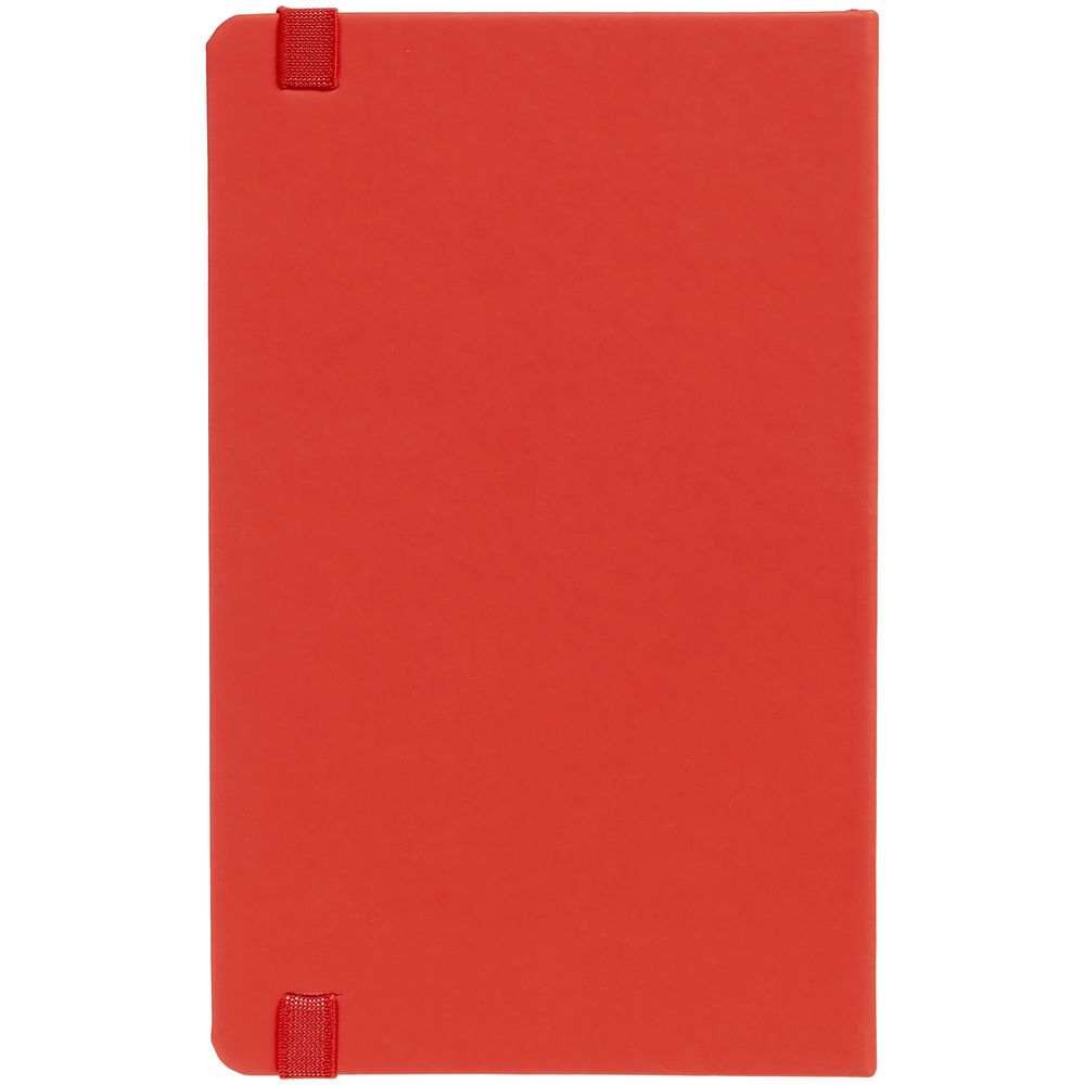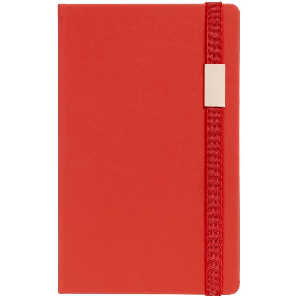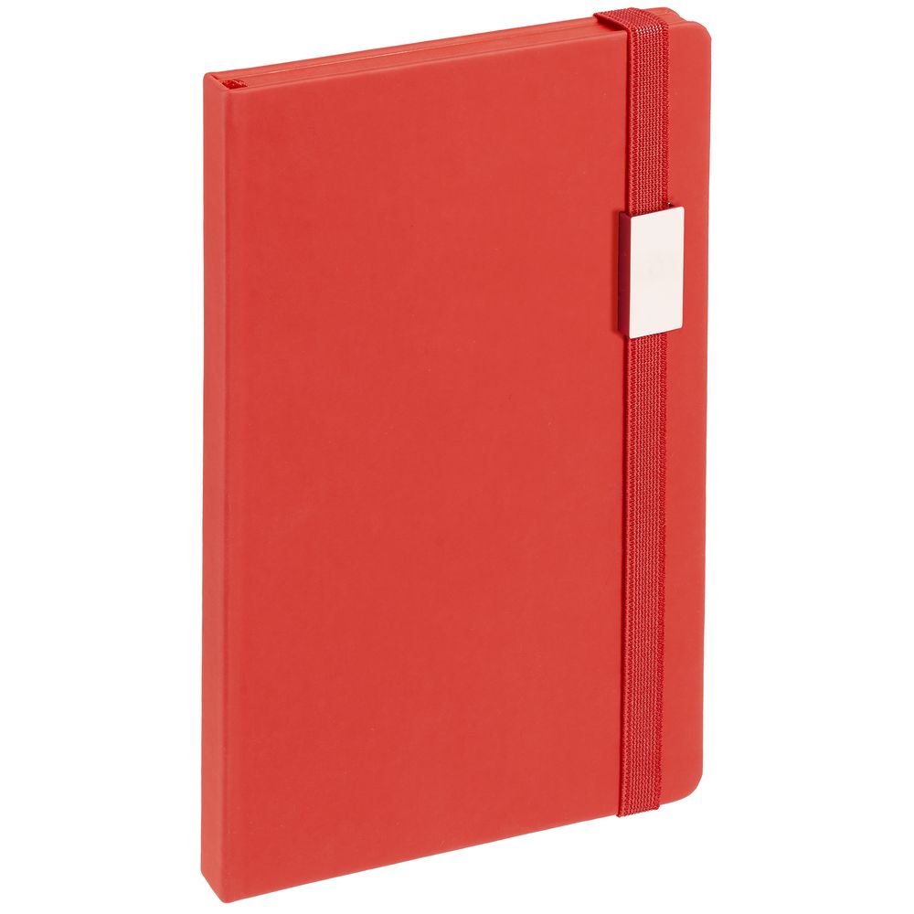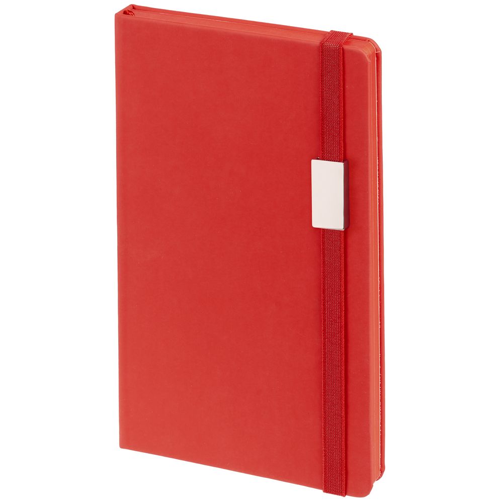 Блокнот в твердой обложке, выполнен из материала Soft Touch Ultra, красный РР, дополнен резинкой и ляссе в цвет обложки.