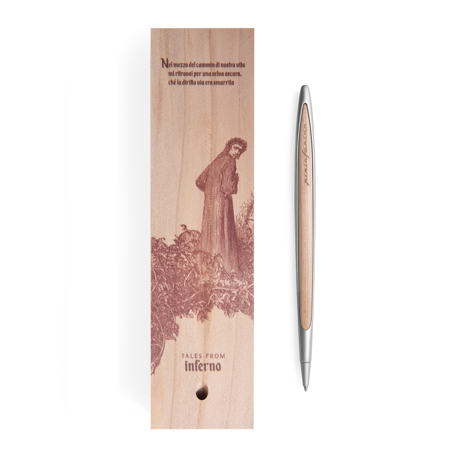 Лимитированная коллекция бренда Pininfarina в память о Данте Алигьере, приуроченная к 700-летию его смерти, с изображениями TALES FROM INFERNO - первой части Ад знаменитой Божественной Комедии. Коробка из массива кедра, которая является одновременно настольной подставкой для шариковой ручки Cambiano, с иллюстрацией Гюстава Доре, изображающей темный лес, как аллегорию греха, где заблудился Данте, и где каждый человек может заблудиться на пути своей жизни. Корпус ручки выполнен из алюминия с вставками из кедрового дерева. Вес ручки 39 гр, длина 16 см. В ручке используется шариковый стержень CROSS® 8513 с синей пастой. Набор упакован в подарочную коробку.