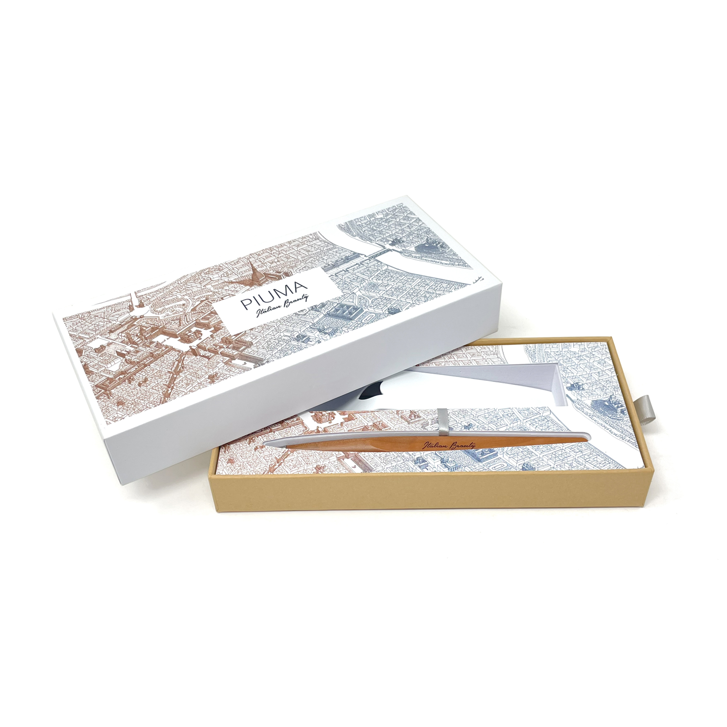 Шариковая ручка Pininfarina Piuma Турин из лимитированной коллекции дизайнеров Pininfarina в сотрудничестве с Francesco Corni Foundation, посвященной красоте Италии и представленной 8 городами. Франческо Корни - выдающийся дизайнер из Модены, посвятивший свою жизнь популяризации истории и архитектуры. Используя трехмерное перспективное видение, он изучает наиболее значимые здания каждого города, выбирает наилучшую точку обзора, чтобы подчеркнуть их особенности, и прорисовывает детали в древней технике калиграфии. Дополняет видение мастера умелое использование цветов, по одному для каждого города. Для Турина дизайнер выбрал центральной точкой площадь Piazza Castello и сапфировый цвет, в результате подарочная коробка c ручкой Pininfarina PIUMA становится произведением искусства. PIUMA - ручка динамической формы в виде гусиного пера. Дизайнеры вдохновлялись Кодексом о полете птиц мастера Леонардо да Винчи, целью которого было понять тайну полета и который хранится сейчас в Королевской библиотеке Турина. Piuma находится в постоянном равновесии со своим центром тяжести благодаря белому стальному пьедесталу. На ручке стильный логотип Italian Beauty, она полностью сделана из дерева груши. В ручке используется шариковый стержень Schmidt ® S635 (D1) с синей пастой. Набор упакован в белую подарочную коробку.