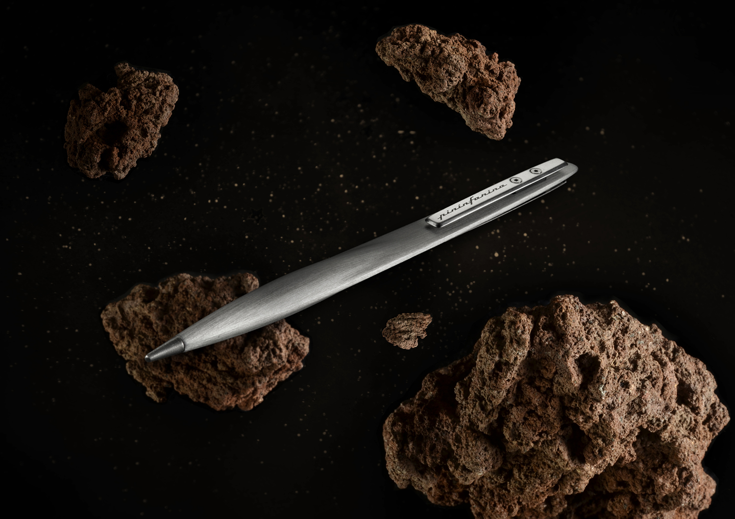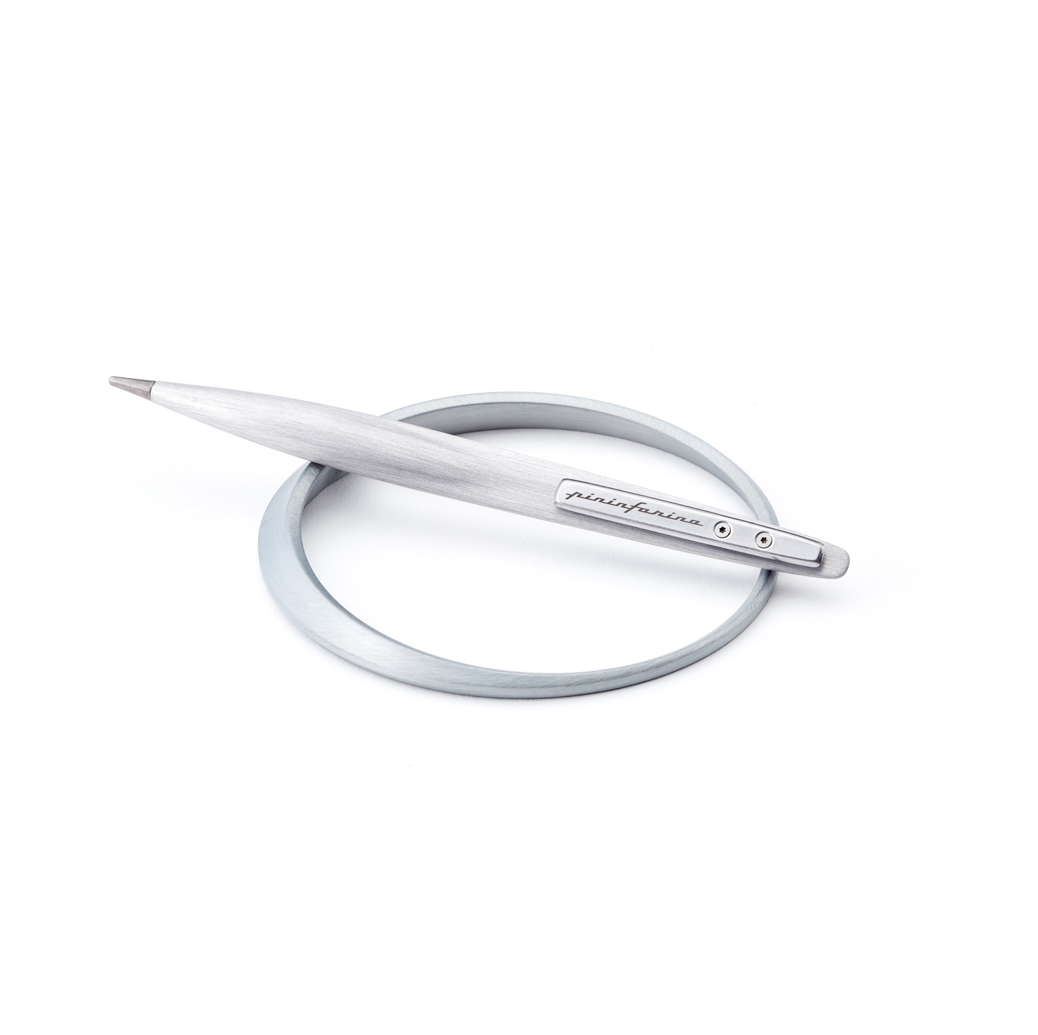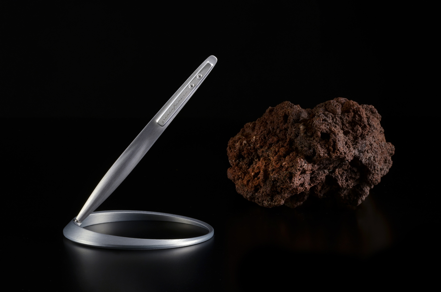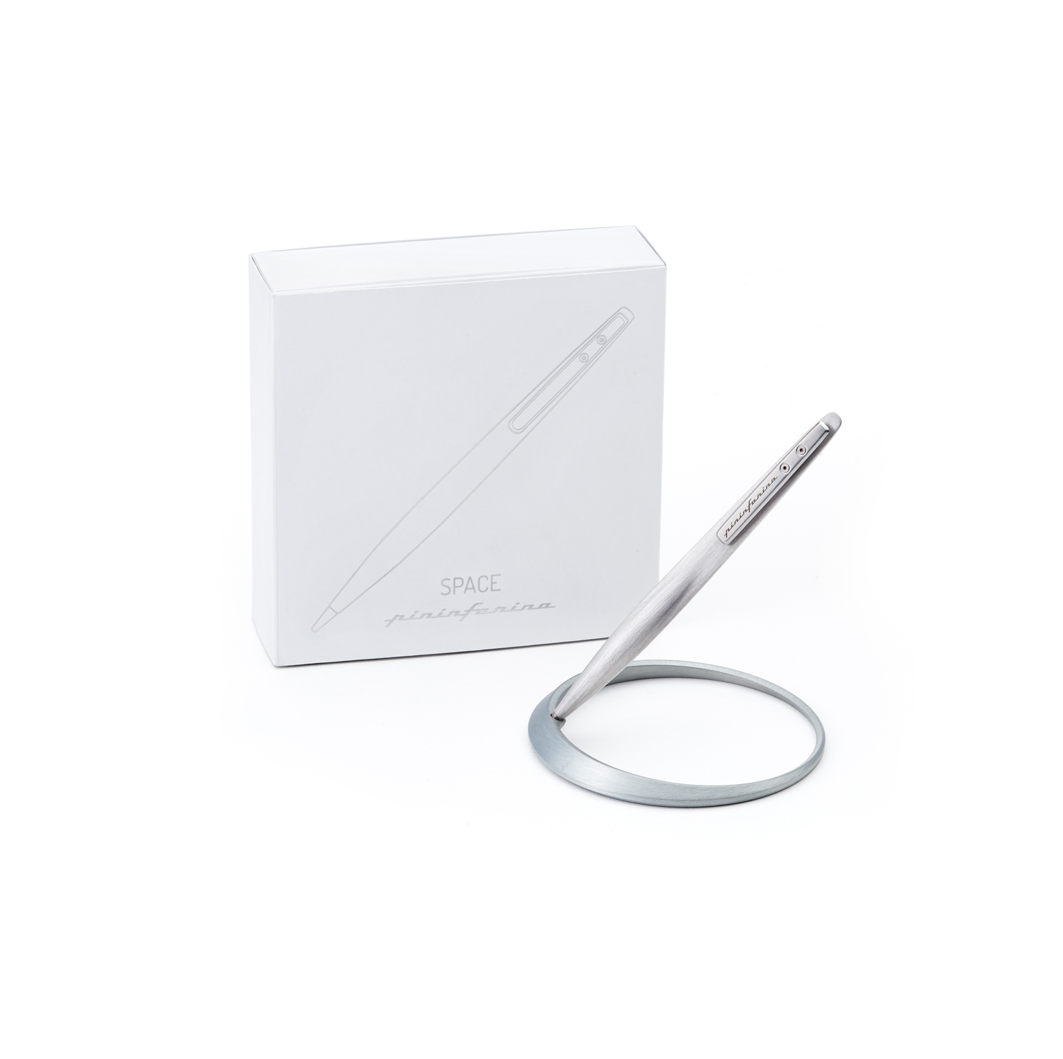 Pininfarina Space серого цвета - тонкая ультралегкая ручка из магния на алюминиевой подставке символизирующей земную орбиту. Эта изящная подставка будет необычным аксессуаром на письменном столе, служа подставкой для ручки. Вес ручки всего 15 гр при стандартной длине 15,7 см. Пишущий наконечник Ethergraf, который изготовлен из сплава металлов по запатентованной технологии. Наконечник не содержит свинец и алюминий, производится вручную итальянскими мастерами и практически не расходуется за десятилетия использования. При соприкосновении с поверхностью бумаги, происходит химическая реакция и наконечник оставляет серебристый след, который напоминает цвет графитового карандаша, но обладает большей стойкостью. Идеально пишет на каменной бумаге. Pininfarina Space - была подарена экипажу Международной космической станции во время последней миссии Vita, ручка успешно использовалась астронавтами во время полета, ведь она пишет в условиях микрогравитации в отличие от обычных ручек.