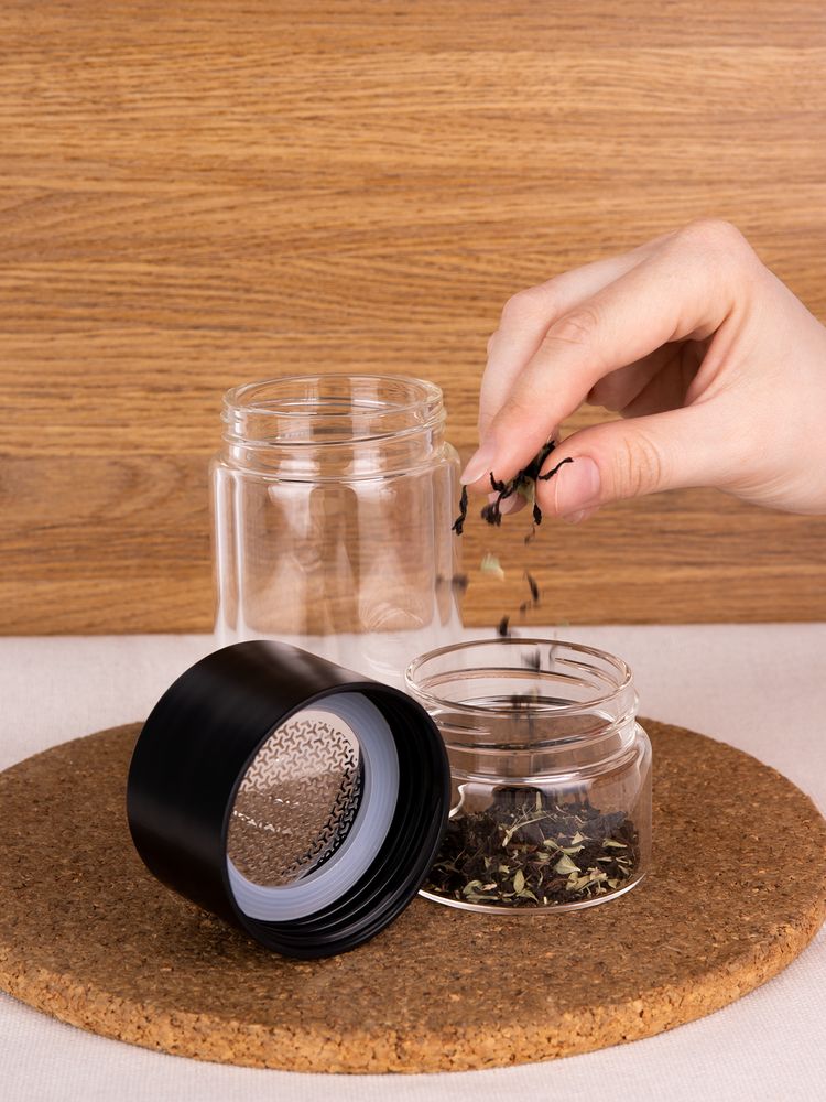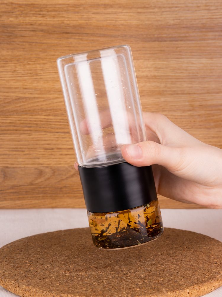 Благодаря конструкции с двумя отсеками, разделенными сетчатым фильтром, можно остановить процесс заваривания в любой момент — просто перевернув бутылку. Так настой не получится слишком крепким, а чайный лист получится залить кипятком еще несколько раз, имитируя традиционный способ заваривания проливами. Объема получившегося напитка как раз хватит на стандартную офисную кружку (около 300 мл).
