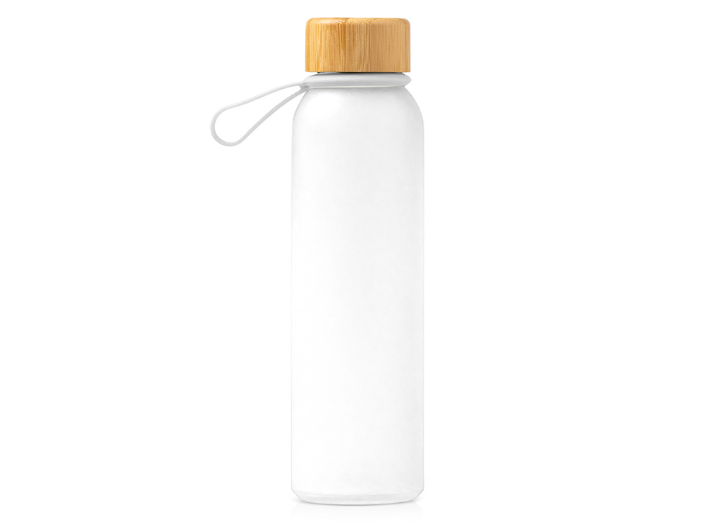 Полупрозрачная бутылка из переработанного стекла. Бамбуковая крышка с держателем. Объём: 500 мл. Поставляется в индивидуальной коробке. Трафаретная печать круговая (1 цвет (цветные изделия)) на данный товар осуществляется бесплатно. Оплачивается только настройка оборудования в размере 4500 рублей на весь тираж.