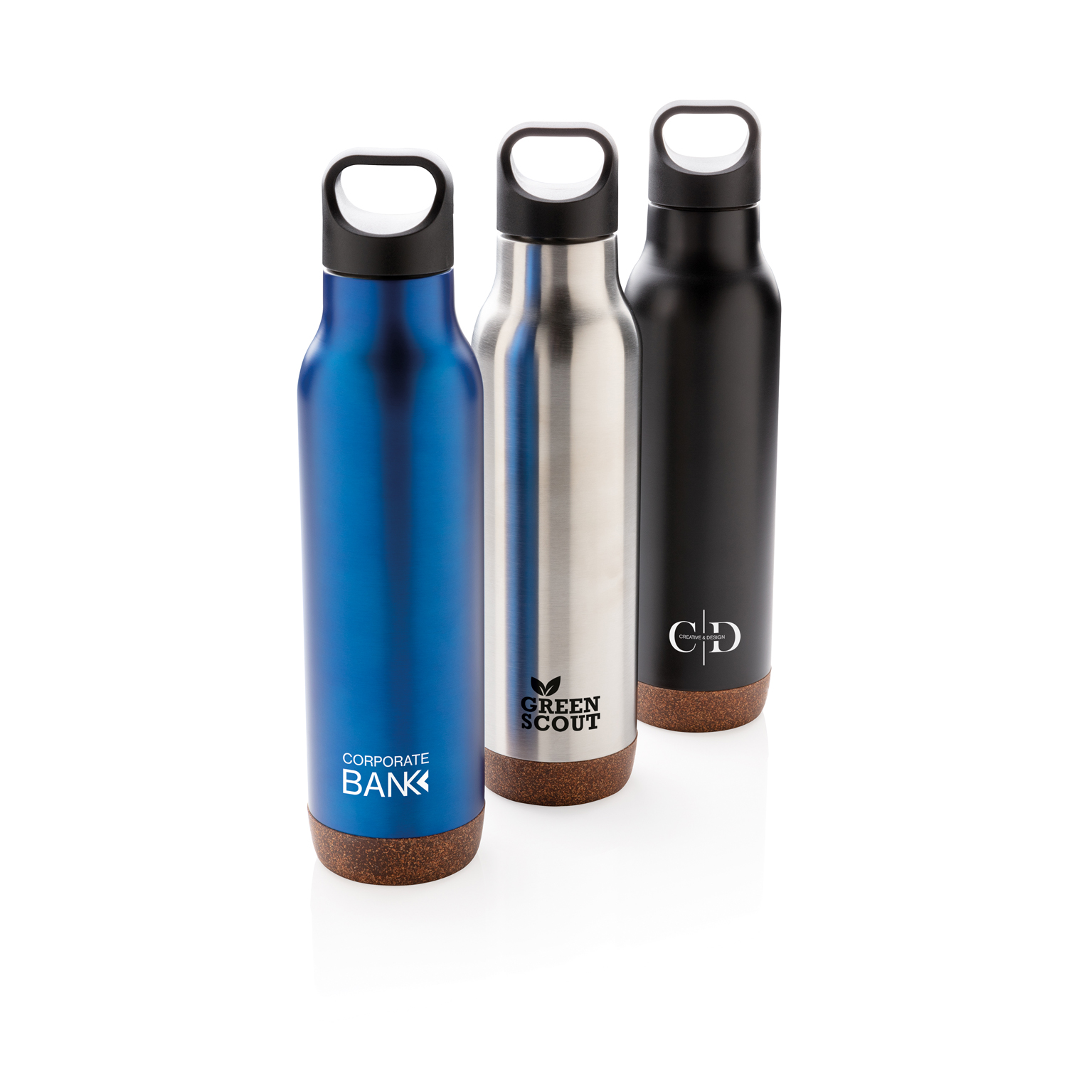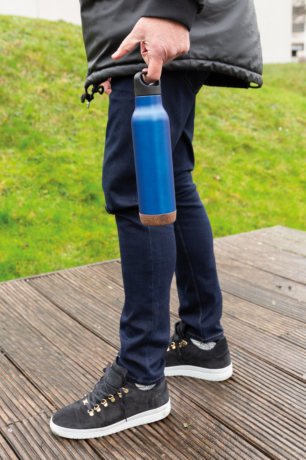 Герметичная вакуумная бутылка. Внутренняя стенка бутылки выполнена из нержавеющей стали марки 304, внешняя – из нержавеющей стали марки 201. Низ бутылки сделан из коры пробкового дуба – одного из самых лёгких, натуральных природных материалов. Пробка - 100% экологичный материал, а главное, что его производство не вредит деревьям. Благодаря своим уникальным свойствам пробка не впитывает влагу, обладает хорошей термоизоляцией и приятна на ощупь. Бутылка сохранит ваши напитки теплыми до 5 часов и прохладными до 15 часов. Объем: 600 мл