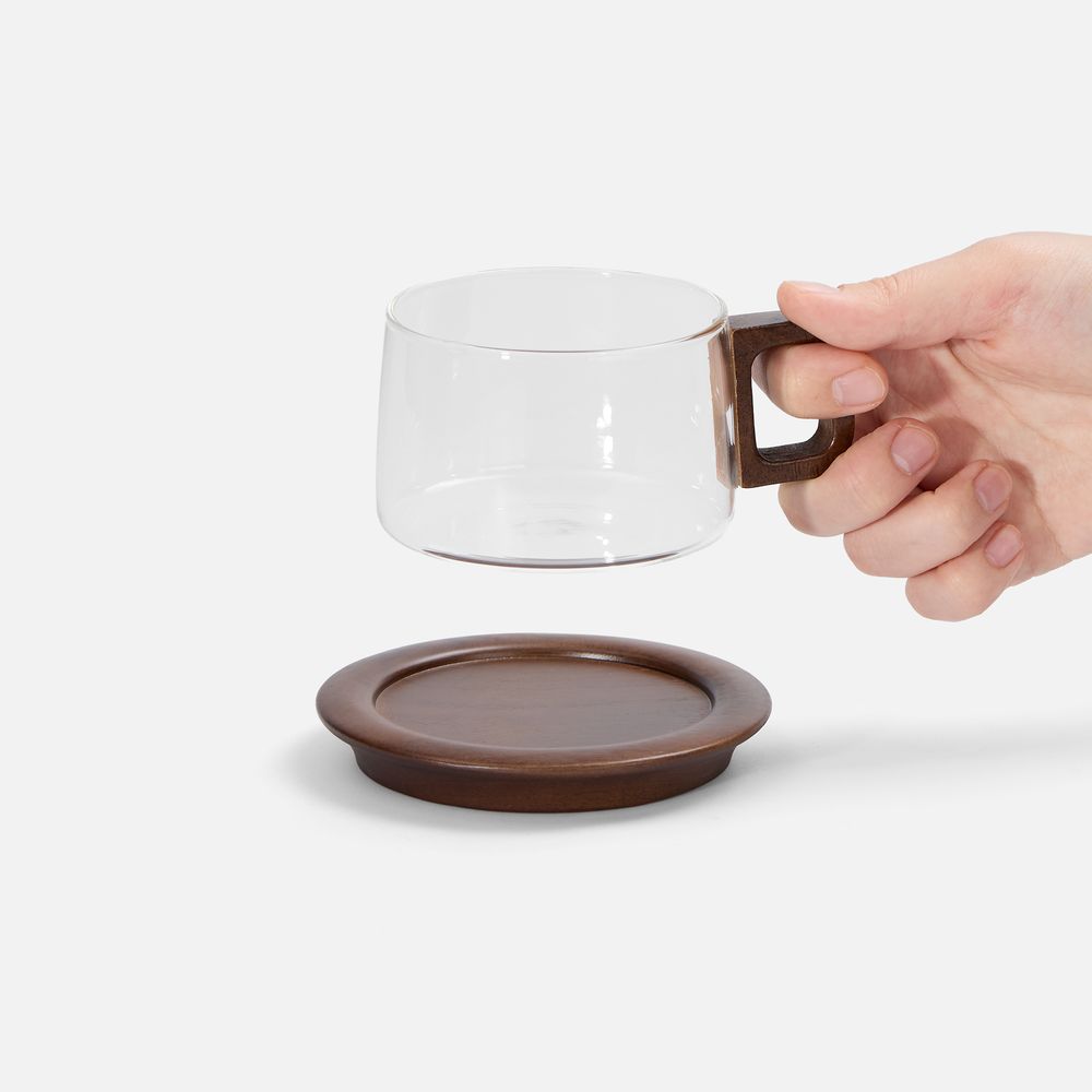 Чайная пара Arbori с чашкой из прочного боросиликатного стекла в сочетании с элементами из ореха станет изюминкой домашней или офисной подачи горячих напитков.
