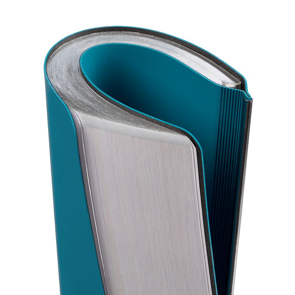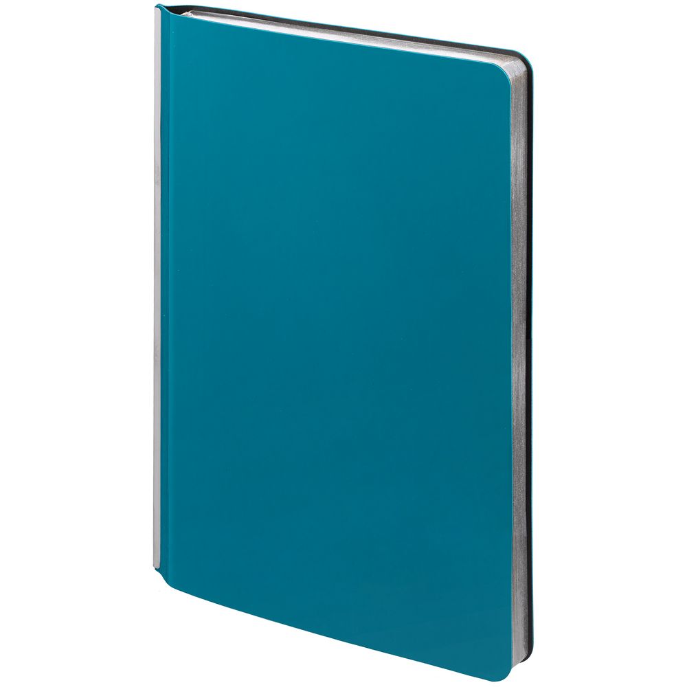 Ежедневник с гибкой обложкой и металлическим корешком, выполнен из материала Soft Touch, цвета морской волны II, дополнен серебристым обрезом блока и ляссе.