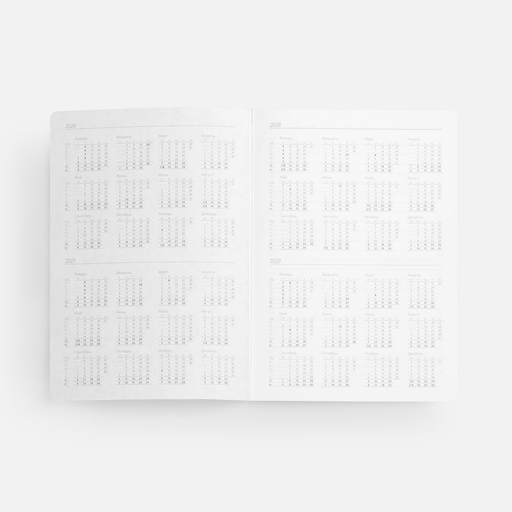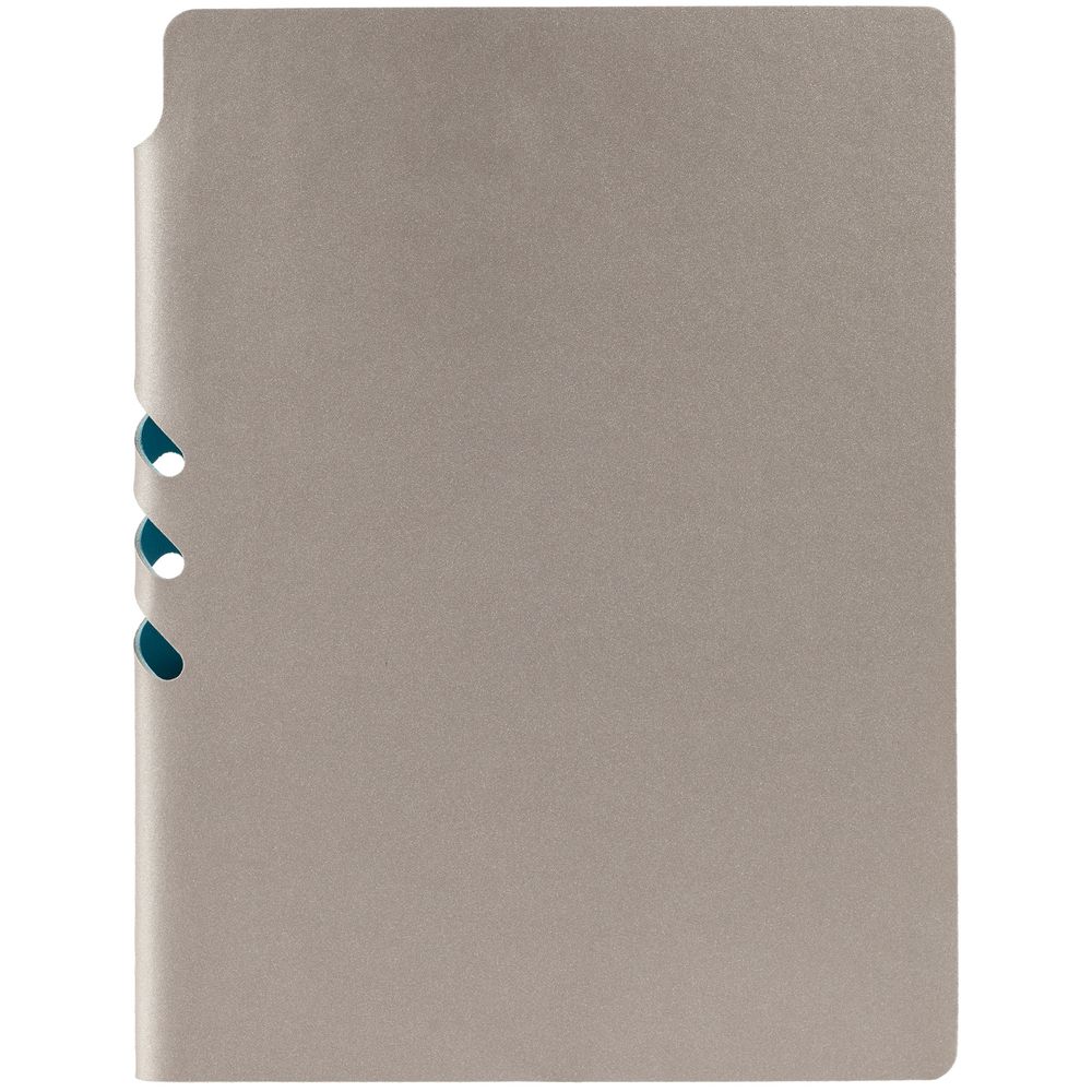 Гибкая обложка выполнена из материала Velour Melange, серый СС и Latte, бирюзовый II (внутренняя часть обложки). Внутри корешка — специальное место для крепления ручки размером до 15х0,9 см.