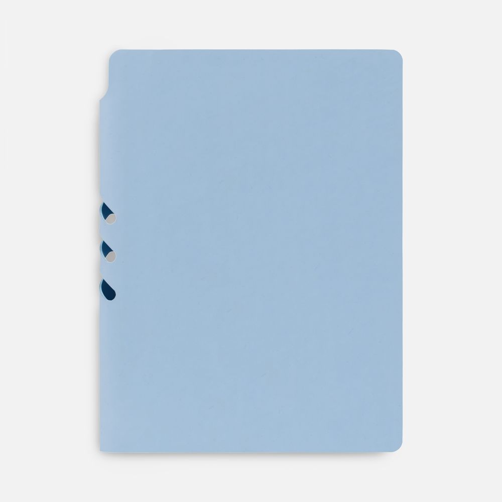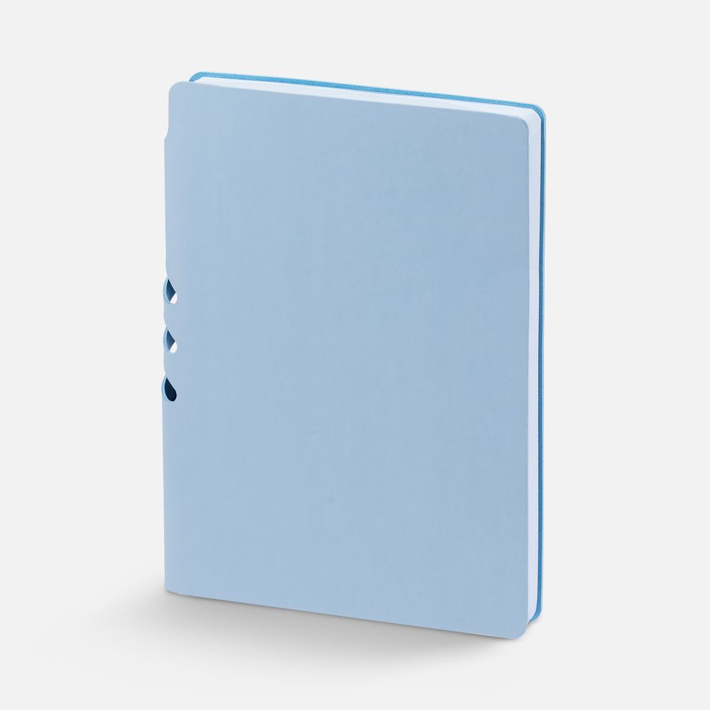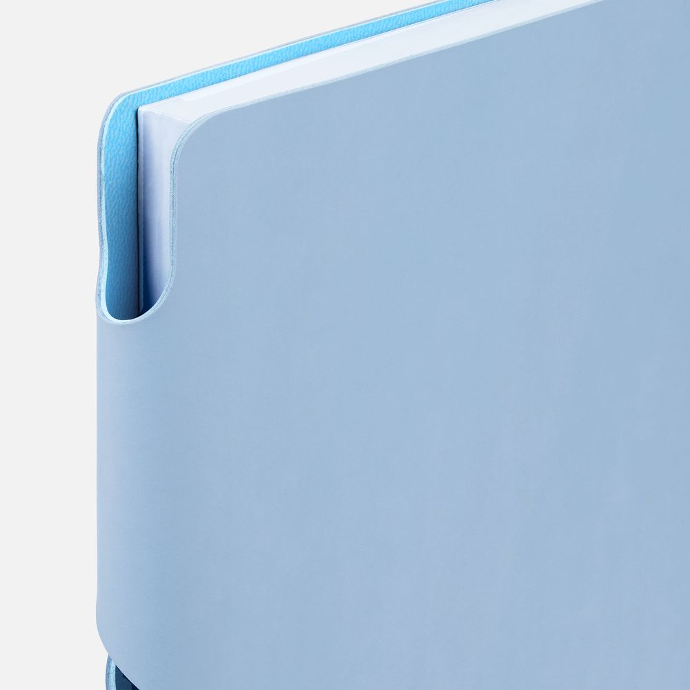 Гибкая обложка выполнена из материала Soft Touch, голубой JJ и Latte, голубой JJ (внутренняя часть обложки). Внутри корешка — специальное место для крепления ручки размером до 15х1 см.