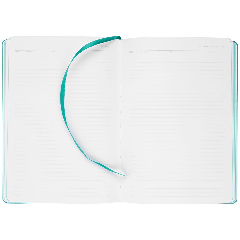 Ежедневник с твердой обложкой. Выполнен из материала Latte, бирюзовый, дополнен ляссе в цвет обложки.