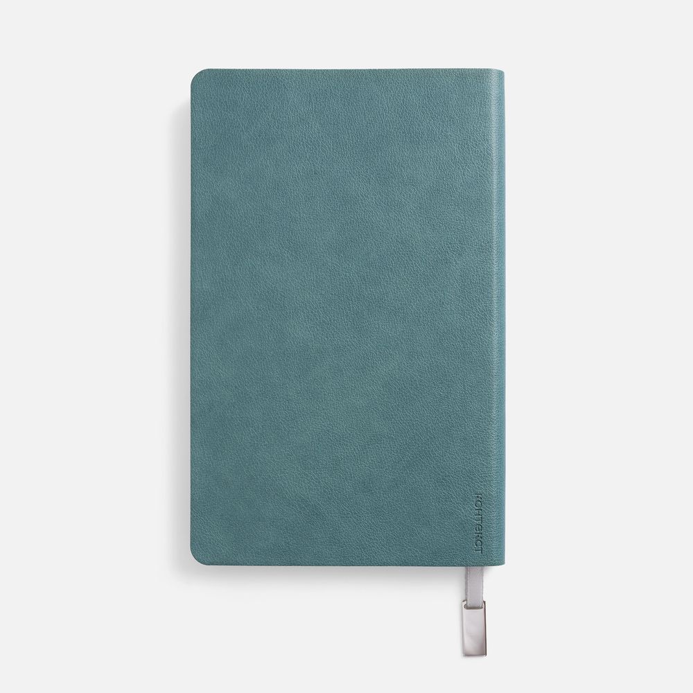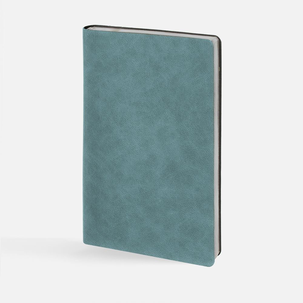 Ежедневник с гибкой обложкой, выполнен из материала Petrus, голубой JJ, дополнен серым ляссе с металлическим шильдиком.