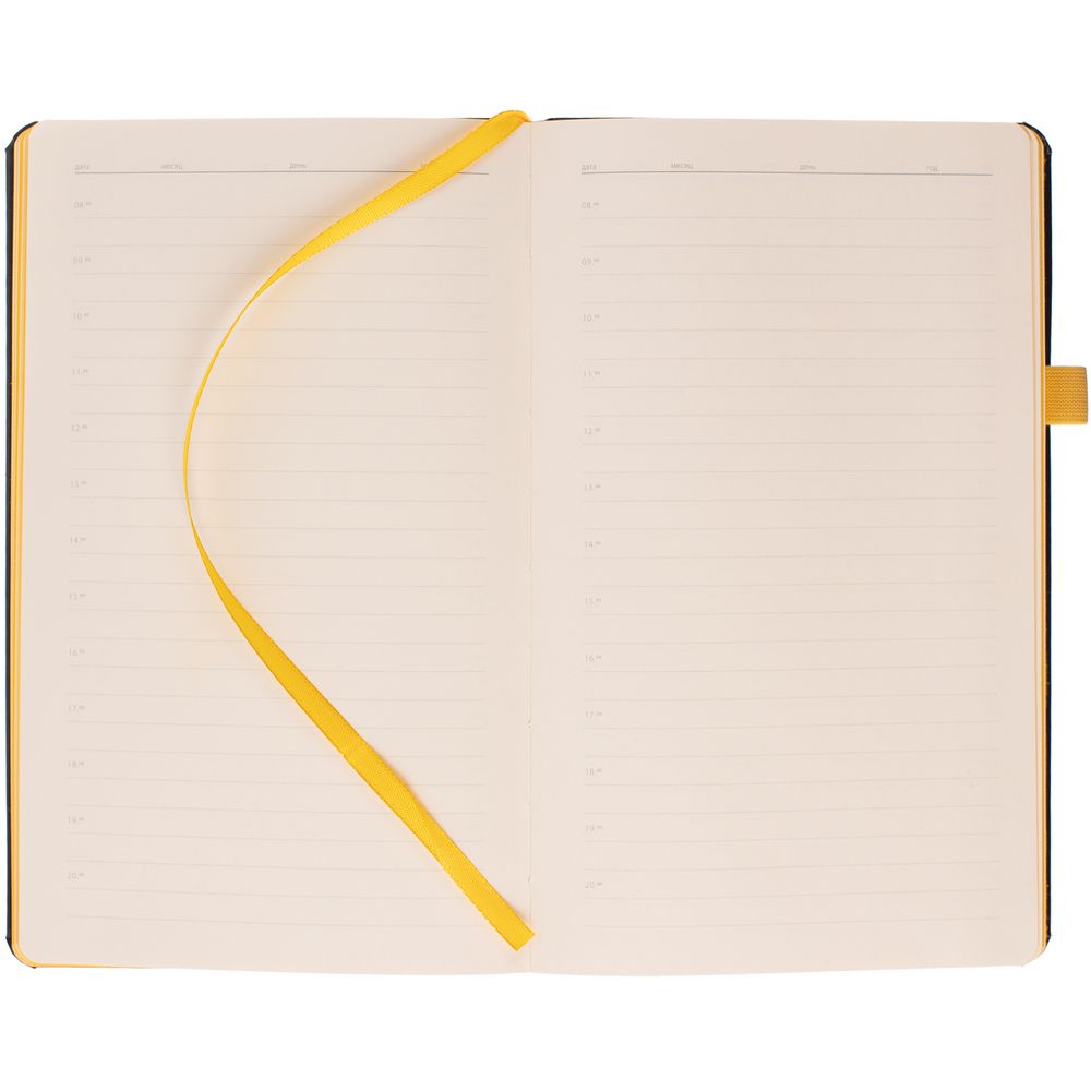 Ежедневник с твердой обложкой, выполнен из материала Waltz, черный АА, дополнен желтой резинкой с металлическим шильдом и ляссе.