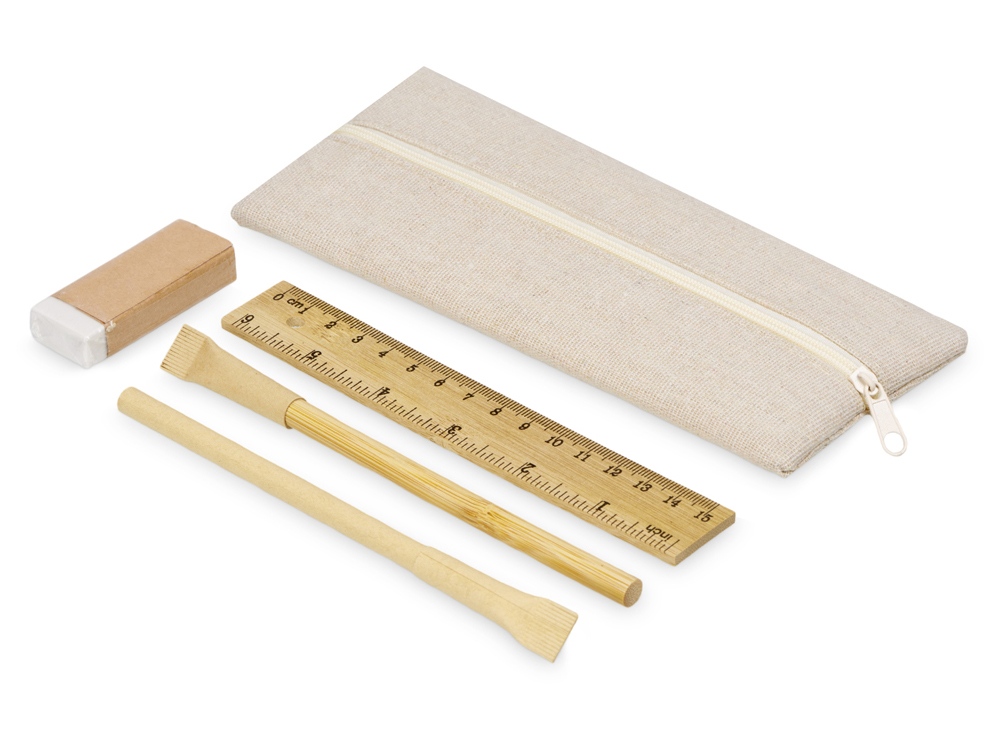 Удобный набор канцелярии со всем необходимым. В наборе: пенал на молнии, ручка Recycled, вечный карандаш в бамбуковом корпусе с колпачком из переработанной бумаги, ластик и бамбуковая линейка. Чтобы все самые необходимые пишущие принадлежности были под рукой.