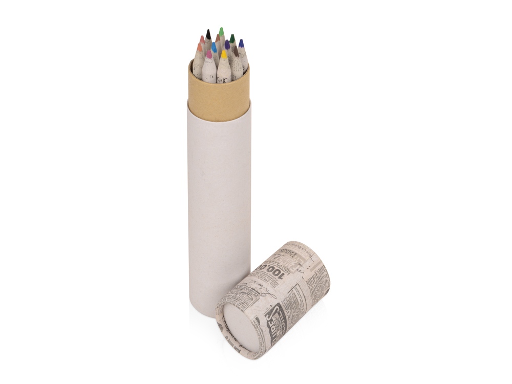 Набор цветных карандашей, выполненных в оригинальном корпусе из имитации газетной бумаги. Благодаря пеналу в форме тубуса удобно хранить или брать с собой. Набор состоит из карандашей 12 цветов. Тампопечать (1 цвет (цветные изделия)) на данный товар осуществляется бесплатно. Оплачивается только настройка оборудования в размере 4500 рублей на весь тираж.