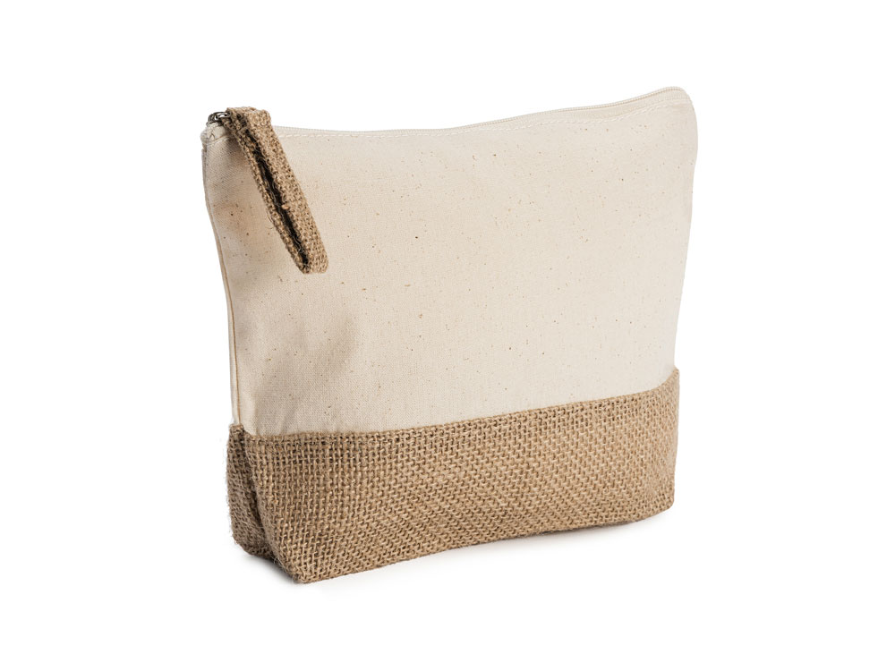 Эко-косметичка из хлопка и джута плотностью 180 г/м² натурального цвета с нижней частью и язычком из джута и застежкой-молнией в тон. Термотрансфер (1 цвет (цветные изделия)) на данный товар осуществляется бесплатно. Оплачивается только настройка оборудования в размере 10000 рублей на весь тираж.