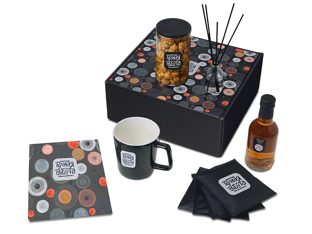 диффузор - стекло, кофе в дрип пакете - пластик, кружка - костяной фарфор, попкорн - пластик, металл, мешок - нетканый материал (спанбонд), коробка - картон