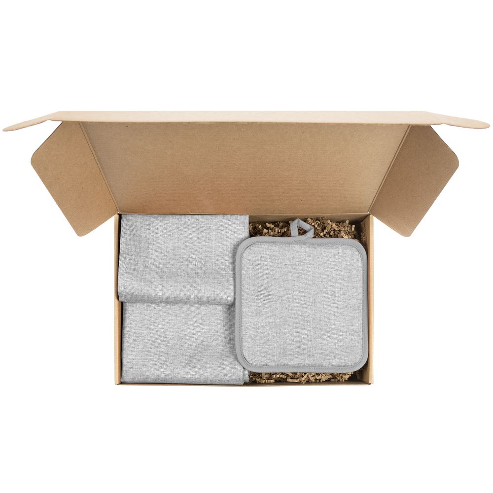 салфетка - полиэстер 100%; прихватка - полиэстер 100%; коробка - микрогофрокартон, плотность 385 г/м²