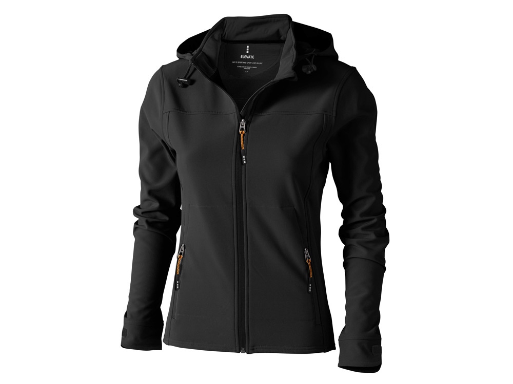 Женская куртка софтшел Ланглей. Стандартный покрой. Отстегивающийся капюшон на шнурках со стопперами. Обратная молния по центру и на карманах для рук. Регулируемые манжеты на липучках. Отражающий лого сзади. Водонепроницаемый 5000 мм. Дышащий 3000 мм. Ткань эластична в четырех направлениях. Ветронепроницаемая. Ремешки на пуллер (второй комплект в цвете антрацит). Ткань из 90% полиэстера и 10% эластана, склеенного со 100% полиэстеровым микрофлисом. 300 г/м². Термотрансфер (1 цвет (цветные изделия)) на данный товар осуществляется бесплатно. Оплачивается только настройка оборудования в размере 10000 рублей на весь тираж.