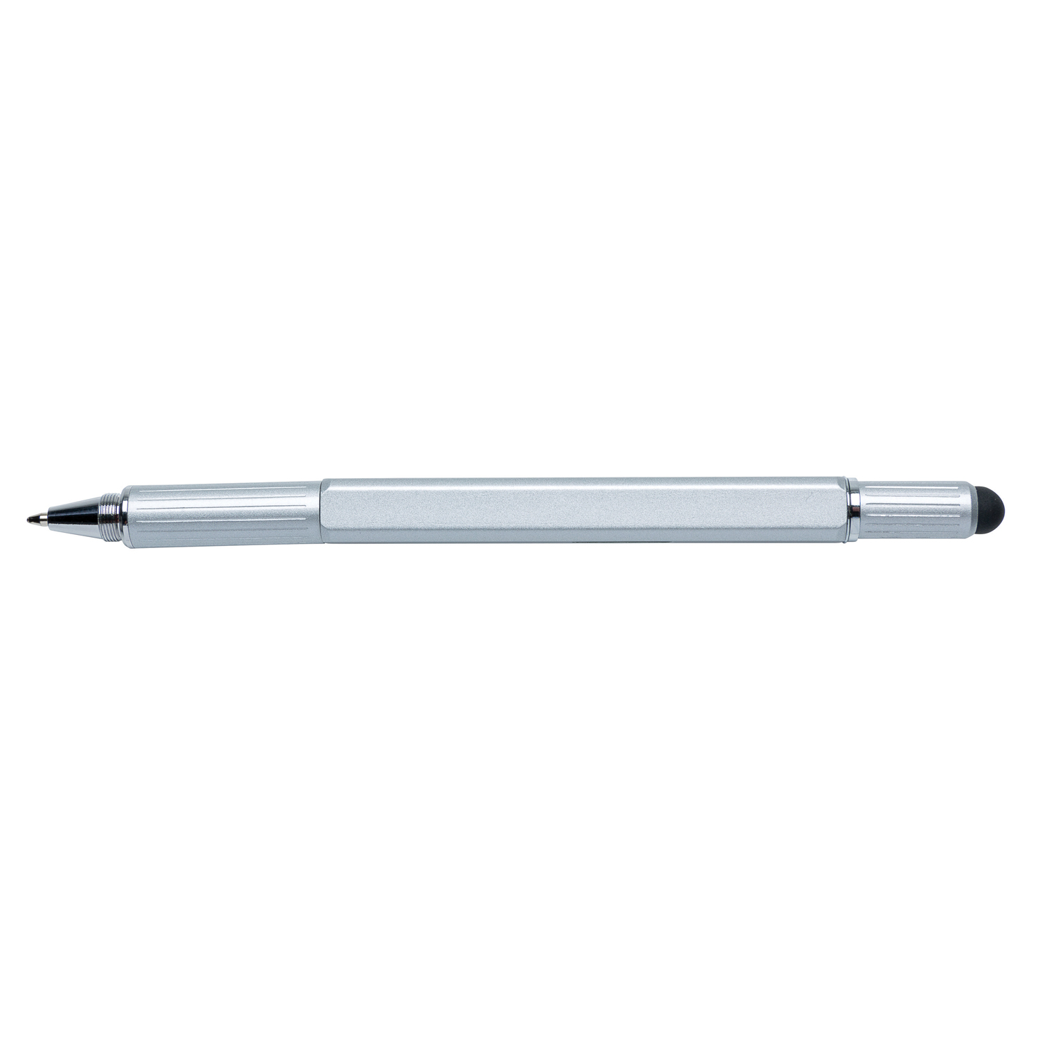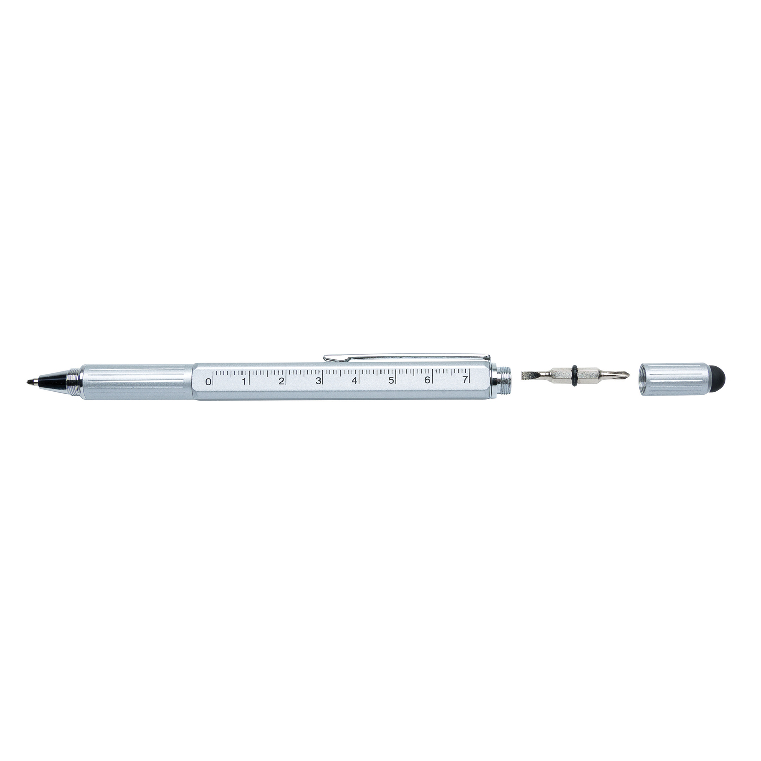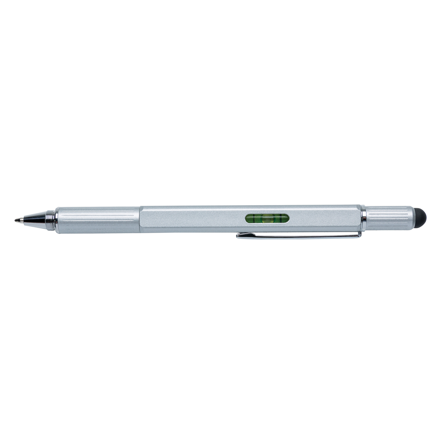 Многофункциональная ручка совмещает в себе линейку длиной 7 см, спиртовой уровень, отвертку, стилус и синюю шариковую ручку, чернил в стержне которой хватит на линию длиной до 400 м. Корпус ручки изготовлен из высококачественной латуни и дополнен удобным алюминиевым клипом.