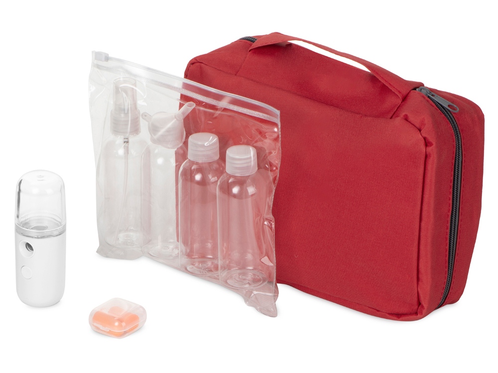 несессер- полиэстер, увлажнитель- пластик, емкости- ПВХ, беруши- полиуретан