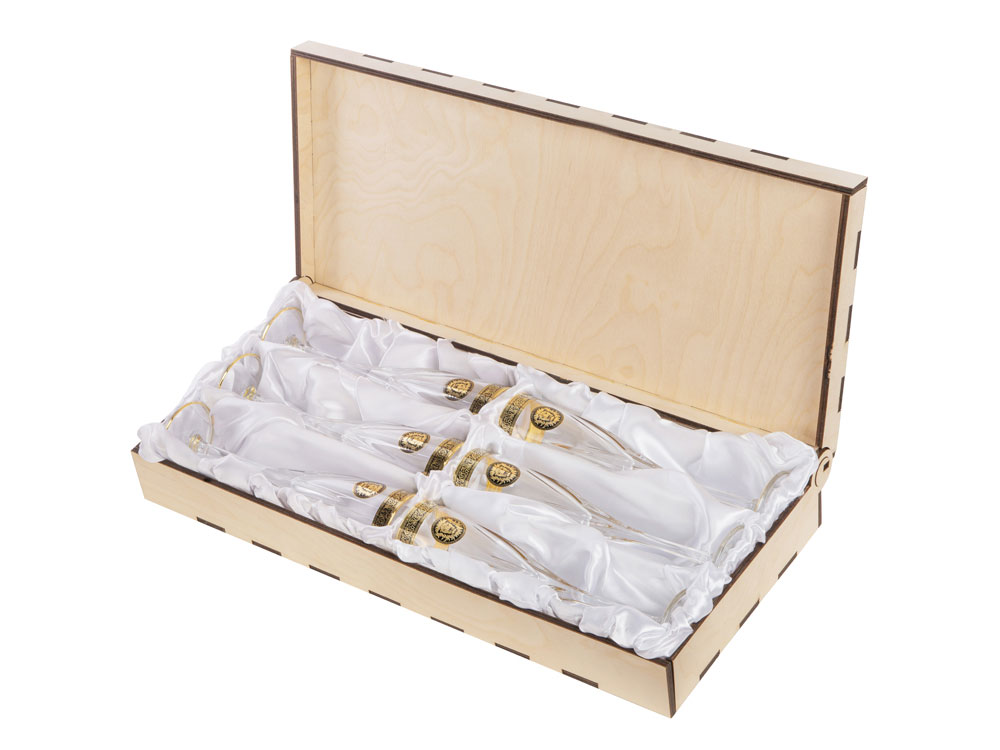 Оригинальный набор бокалов для шампанского, задекорированных золотистым изображением царя зверей – могучего льва. Бокалы выполнены из прозрачного хрусталя с золотистой отделкой по краю и на ножке. Набор рассчитан на 6 персон. Упакован в деревянную коробку. Гравировка (CO2 лазер) (Без чернения) на данный товар осуществляется бесплатно. Оплачивается только настройка оборудования в размере 2700 рублей на весь тираж.