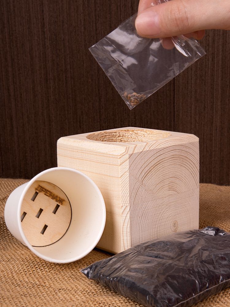 В наборе: деревянный куб, грунт, семена сосны.