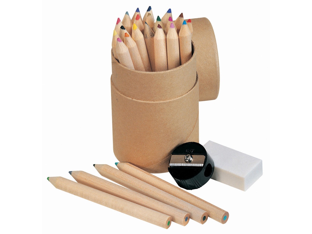 24 цветных карандаша, резинка и точилка в картонной цилиндрической коробке