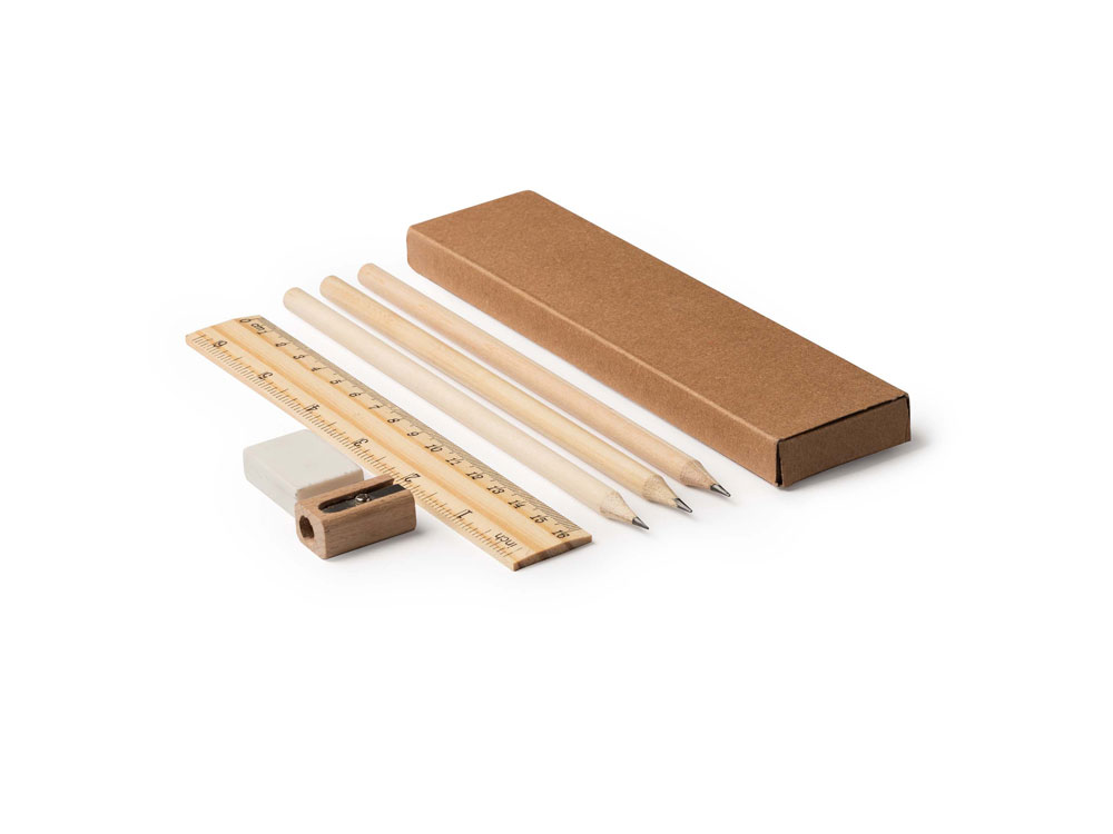Письменный набор из натурального дерева в картонной коробке. В комплекте линейка, 3 карандаша, 1 ластик и 1 точилка.