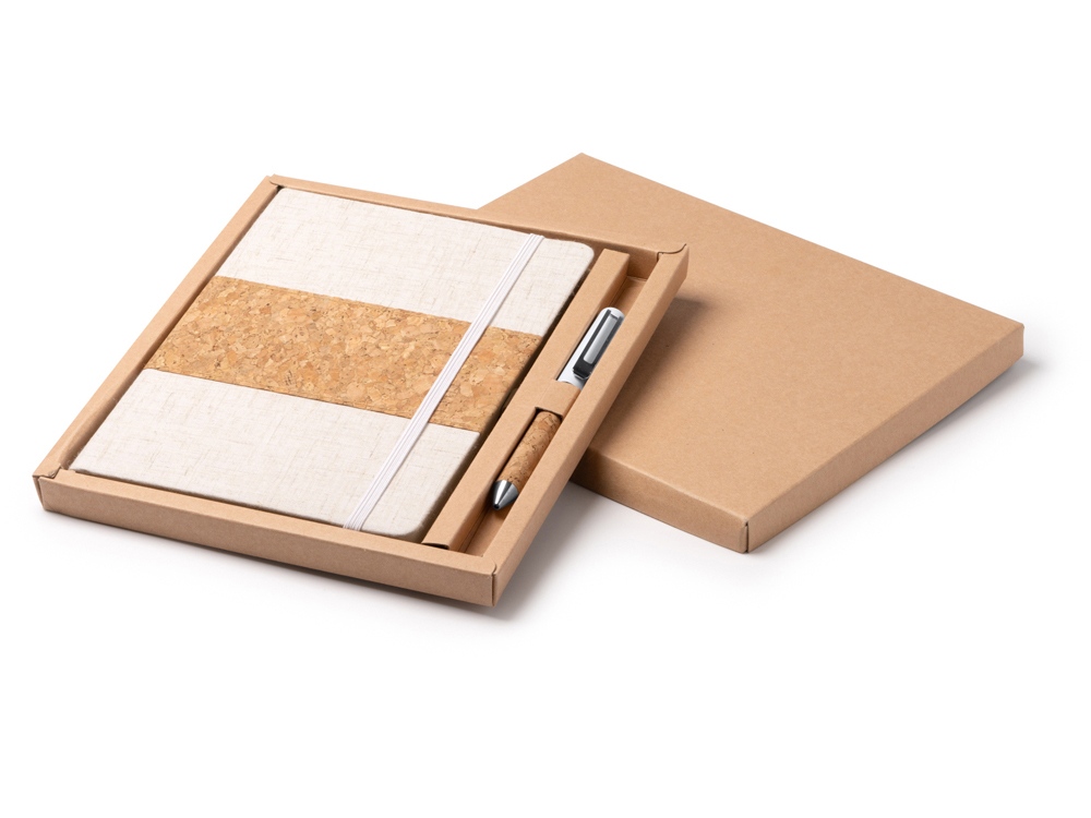 Набор состоит из блокнота A5 и ручки в коробке из крафта. Блокнот в твердой обложке из хлопка и пробки с 80 линованными листами. Металлическая шариковая ручка в корпусе из пробки и с синими чернилами. Трафаретная печать по твердым материалам (1 цвет (цветные изделия)) на данный товар осуществляется бесплатно. Оплачивается только настройка оборудования в размере 4500 рублей на весь тираж.