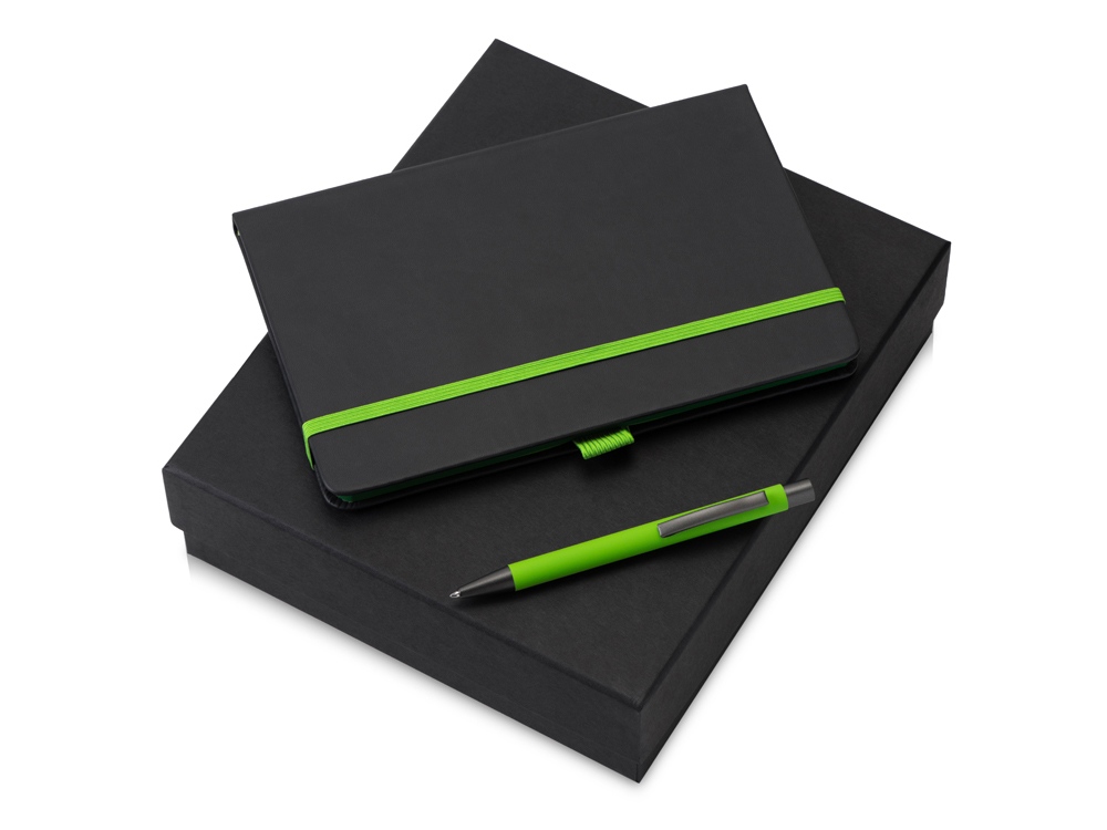 блокнот - искусственная кожа, бумага, ручка - металл с покрытием софт-тач, коробка - кашированный картон