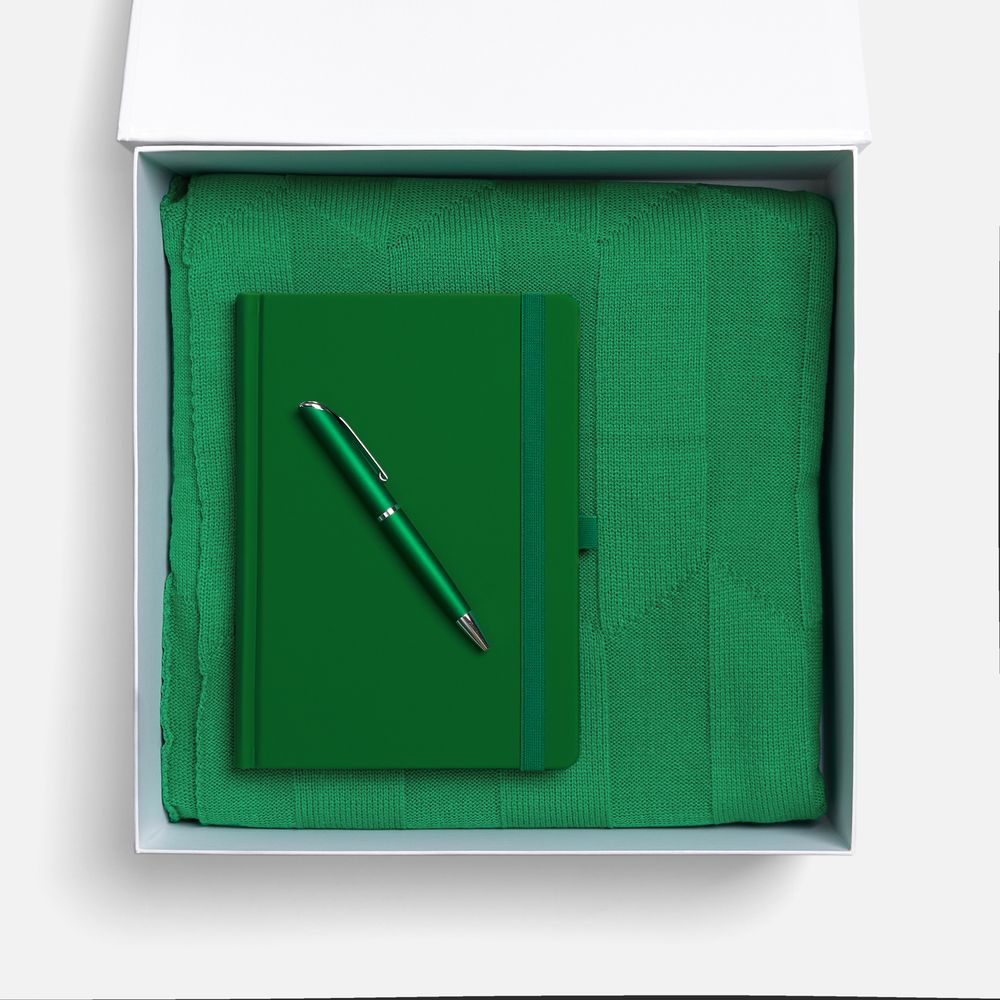 Однотонный набор с основной канцелярией и пледом — классика жанра в уютном исполнении. С компактным ежедневником будет удобно делать заметки в любое время — благодаря петельке для ручки любимый пишущий инструмент будет всегда под рукой. А изысканный акриловый плед с геометрическим узором позволит выразить самые теплые пожелания и ддобавит плавных линий в интерьер.