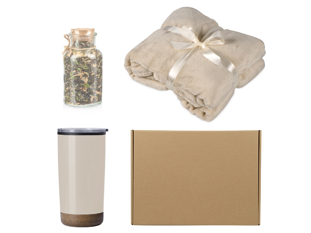 плед - флис из 100% полиэстера, термокружка - нержавеющая сталь снаружи, полипропилен внутри, сокочай - стекло, пробковая крышка, коробка - картон