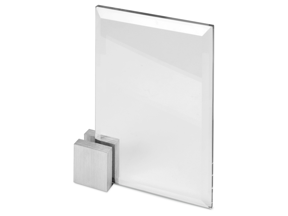 Минималистичная стеклянная награда с небольшим угловым постаментом из стали (не съемный). Внушительная площадь для нанесения обеспечивается простотой формы и маленьким размером постамента. Гравировка (оптоволоконный лазер) (Без чернения) на данный товар осуществляется бесплатно. Оплачивается только настройка оборудования в размере 2700 рублей на весь тираж.