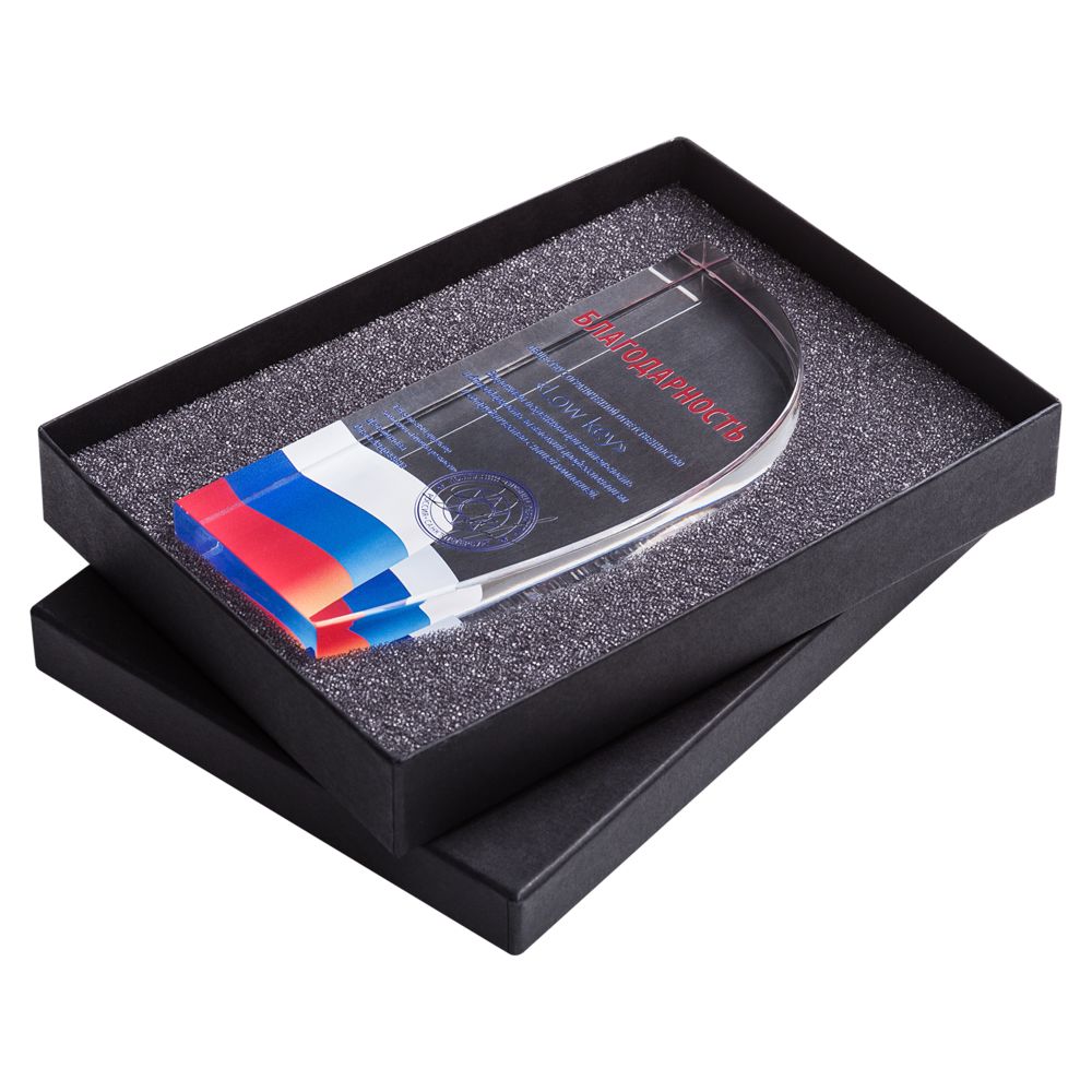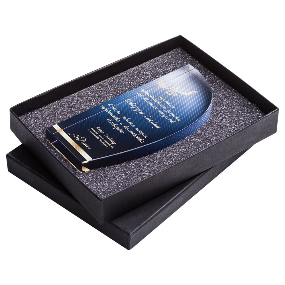Изображение на акриловой стеле может выглядеть объемным. Для этого достаточно оттенить надпись, сделанную на передней грани, рисунком, нанесенным на заднюю.Стела поставляется в подарочной упаковке.