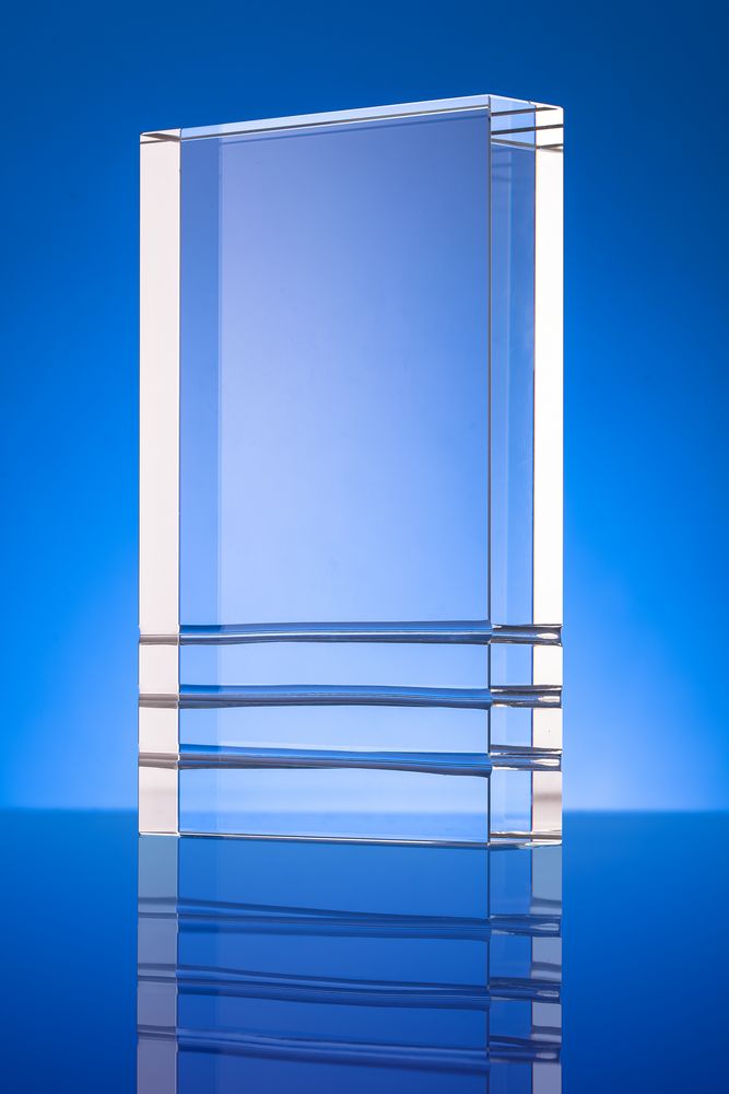 Стела изготовлена из стекла К9, в основе которого лежит оптическое боросиликатное стекло. Эту марку стекла отличает низкий процент посторонних включений, высокий показатель преломления и высокая прозрачность — идеальные качества для изготовления наград премиального уровня.