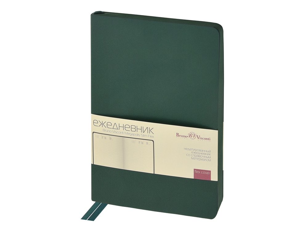 Еще один представитель ежедневников с гибкой обложкой – Megapolis Slim flex, отличительной особенностью которого является двойное ляссе, окрашенный срез, рифленая фактурная обложка. Megapolis Slim Flex — для динамичных людей, живущих в ритме большого города. Тиснение (Блинт) на данный товар осуществляется бесплатно. Оплачивается только настройка оборудования в размере 8700 рублей на весь тираж.