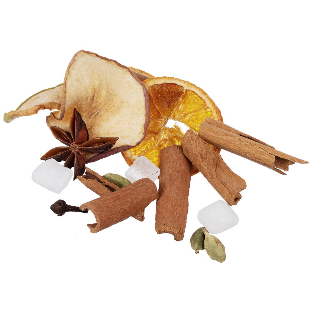 Состав: яблоко сушеное, апельсин сушеный, кардамон, гвоздика сушеная целая, душистый перец горошек, палочки корицы ломанные, сахар леденцовый.