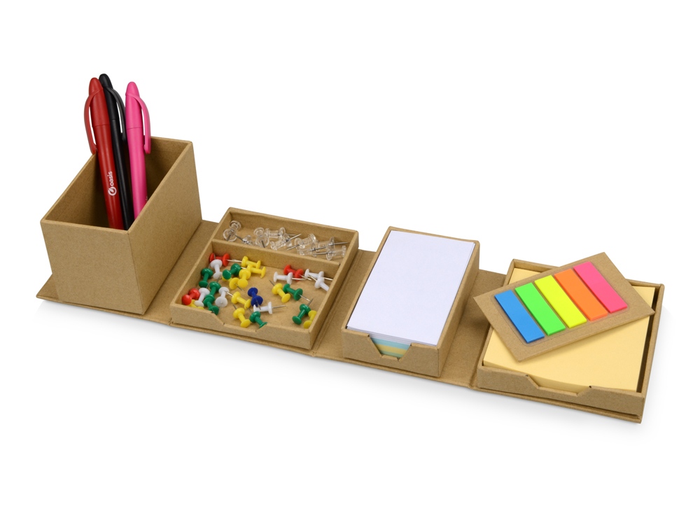 Оригинальная подставка для канцелярии Брик в сложенном виде представляет собой куб. А в разложенном – она превращается в удобный настольный прибор с отделениями для стикеров, бумаги для записей, скрепок и ручек. Настольный куб Брик сделан из бумаги и картона, и является отличным экосувениром. Тампопечать (1 цвет (цветные изделия)) на данный товар осуществляется бесплатно. Оплачивается только настройка оборудования в размере 4500 рублей на весь тираж.