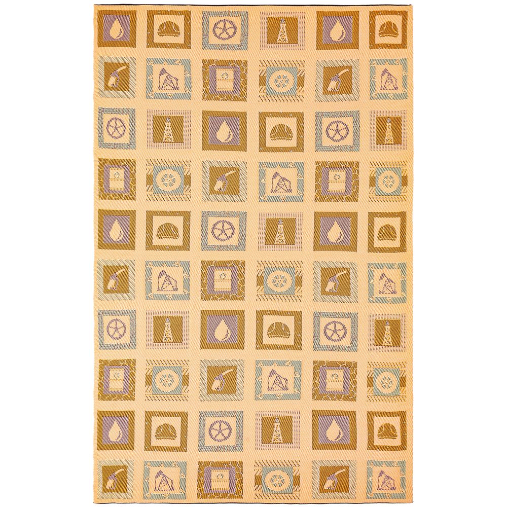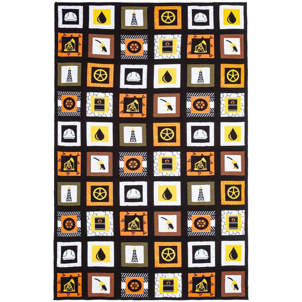 В каждой части общего рисунка, напоминающего лоскутное шитье, в самых теплых красках изображены главные символы нефтяной промышленности.