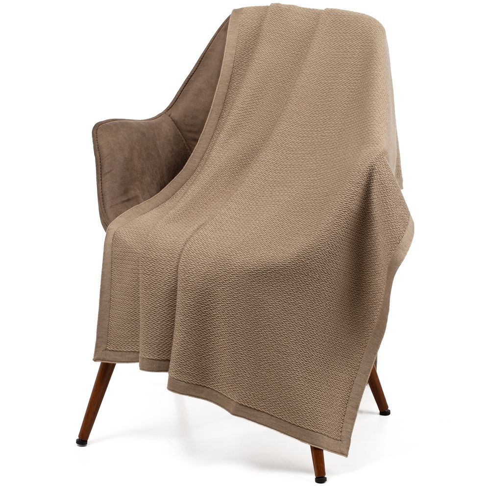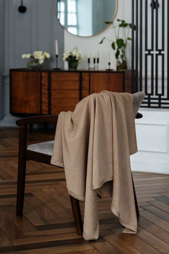 Плед из полушерстяной пряжи, поэтому прекрасно согревает и неприхотлив в уходе.
