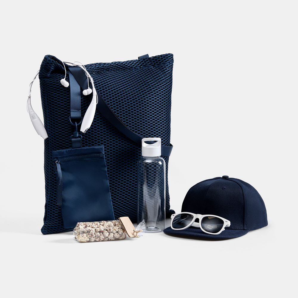 шопер - полиэстер, твил 290D с полиуретановой пропиткой; трехслойная сетка; наушники, очки - пластик; бейсболка - полиэстер 100%, плотность 300 г/м²; бутылка - пластик, ПЭТ