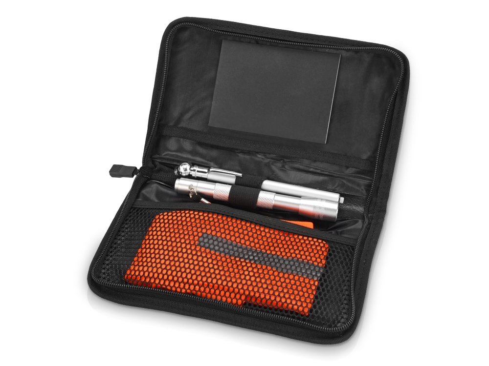 ручка, фонарик, прибор для измерения давления в шинах, блокнот, жилет со светоотражающими элементами