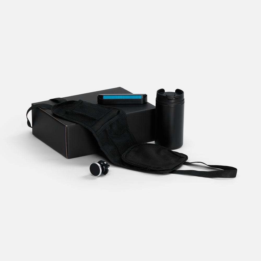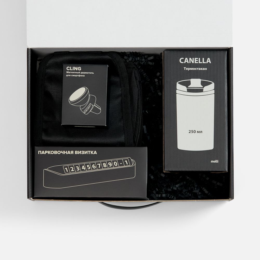 внутренняя стенка и крышка стакана - пластик; внешняя стенка - нержавеющая сталь; магнитный держатель - АБС-пластик; парковочная визитка - пластик; органайзер - полиэстер 100%, плотность 600D; оксфорд; коробка - микрогофрокартон