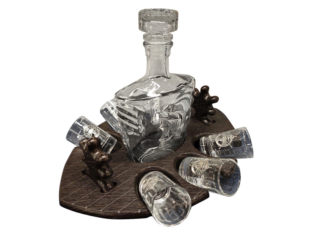 Набор для водки со штофом. В набор входит штоф 0.5 л с оловянным барельефом, шесть стопок 60 мл с оловянным барельефом и подставка мини-бар в форме корабля. Шильд спектрум (Шильд спектрум) на данный товар осуществляется бесплатно. Оплачивается только настройка оборудования в размере 1100 рублей на весь тираж.