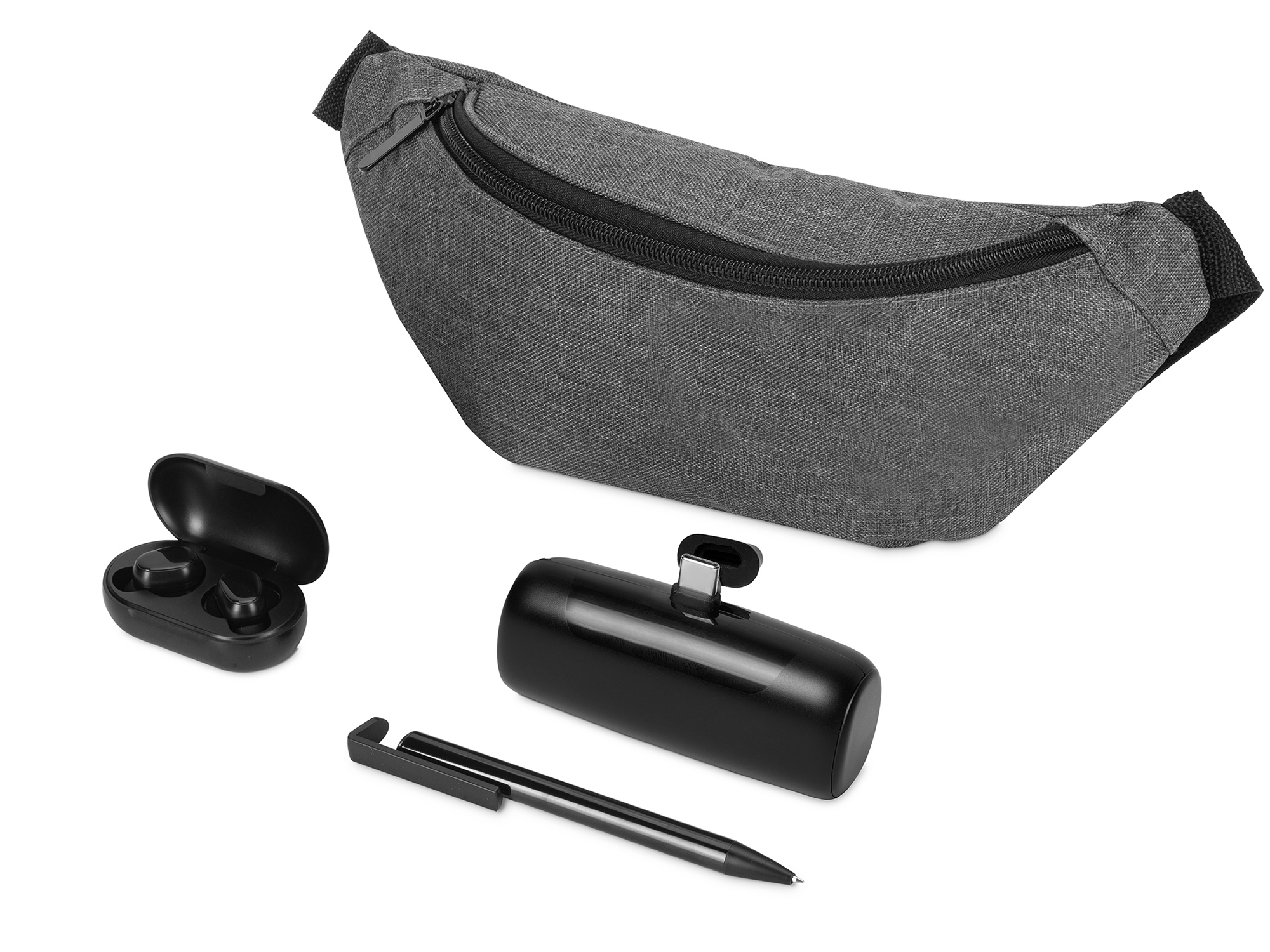 сумка на пояс, ручка шариковая, беспроводные наушники, повербанк