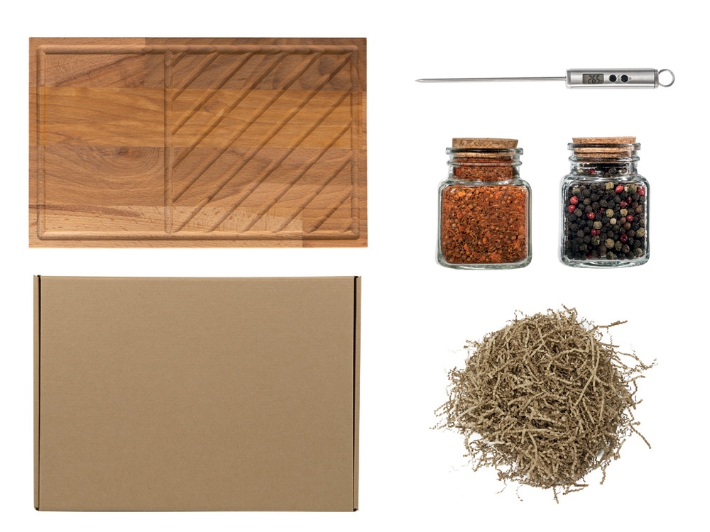 коробка - картон, термометр - нержавеющая сталь, специи - стекло, пробковая крышка, доска - бук