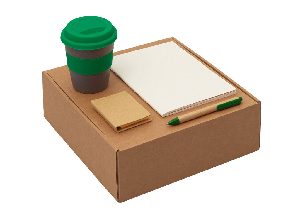 блокнот- бумага из переработанных тетра-паков, ручка- картон, пластик, стакан- 50% бамбуковое волокно, 50% полипропилен, коробка- картон