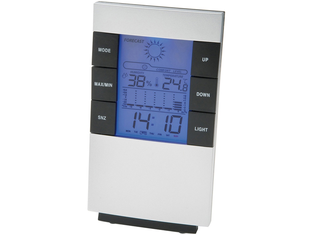 Настольная метеостанция с будильником с повторением сигнала, с указанием даты и дня недели, подсветкой, термометром в градусах по Цельсию и Фаренгейту, гигрометром и прогнозом погоды. Требуются 2 батарейки размера AAA (не включены в комплект). Пластик. Тампопечать (1 цвет (цветные изделия)) на данный товар осуществляется бесплатно. Оплачивается только настройка оборудования в размере 4500 рублей на весь тираж.